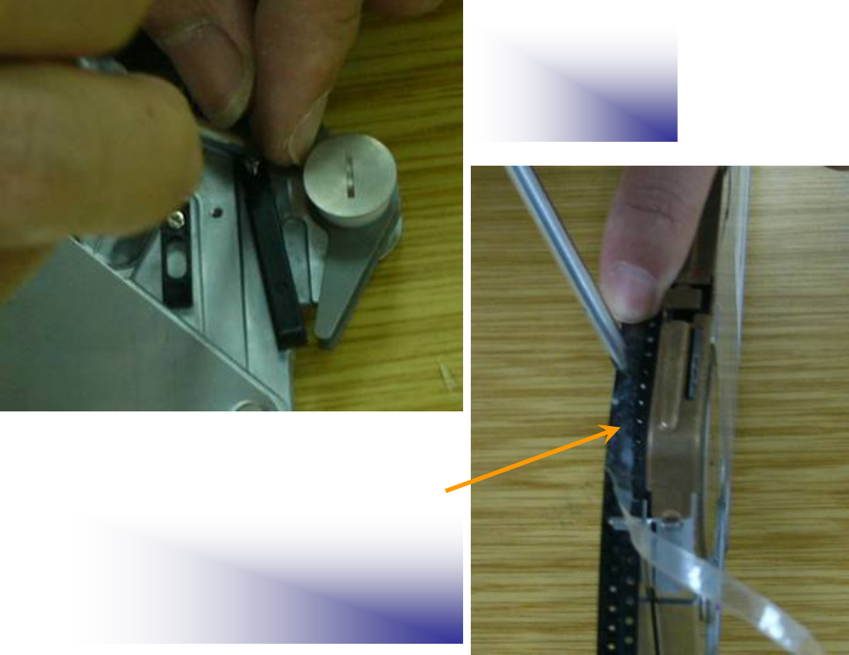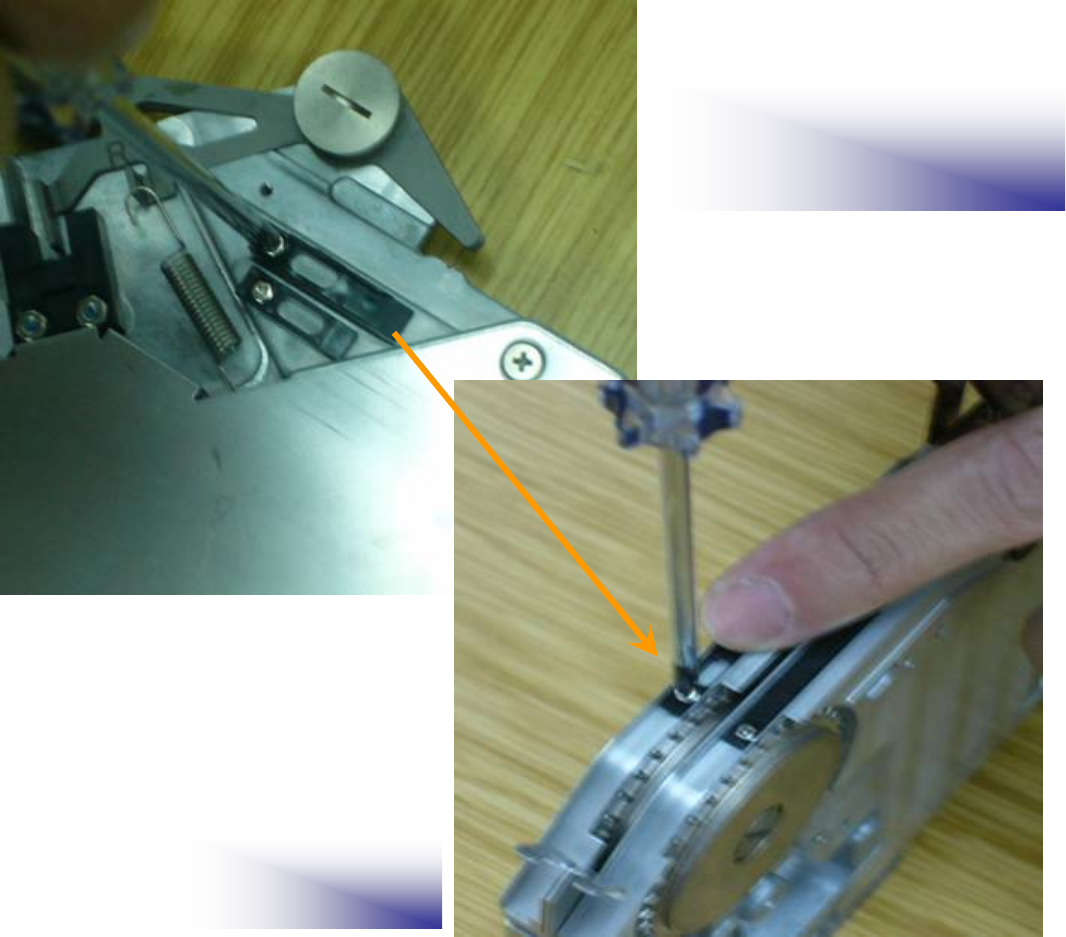 装上编带,用螺丝刀轻轻地压一下编 带,观察垫片的厚度是否合适。 如出现很空洞的感觉,说明垫片的厚 度选择得不合适,需要重新选择。 将拆下的不合适的 垫片装回料架的右 测专用区域上。切 勿乱丢。
