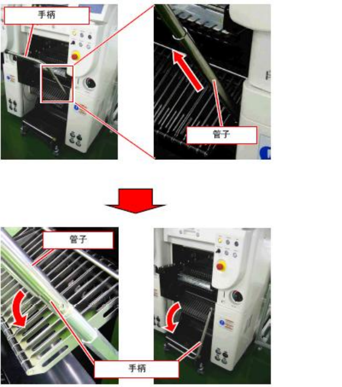 3 按 “EXCHANGE” 键 3 秒 以上。 • 蜂鸣器响的同时将被固定 在主体设备中。 • 从闪炼变成亮灯。 4 将手柄返回。 • 提起手柄的管子,如左图 所示将手柄返回。