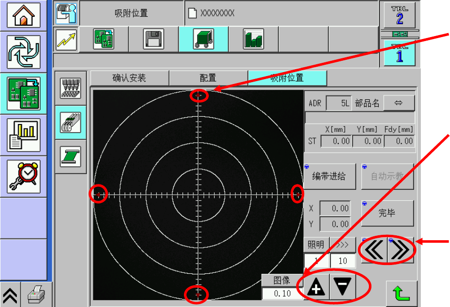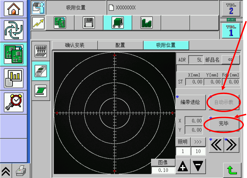 6. 按[自动示教],就会自 动 将照相机移至空腔中心。 不过, 这仅限于卷带宽度为 8 mm 或 12 mm 且带吸着位置自动示教的 元件有效。 7. 按 [ 完毕 ] ,保存所示教的 吸着位置。