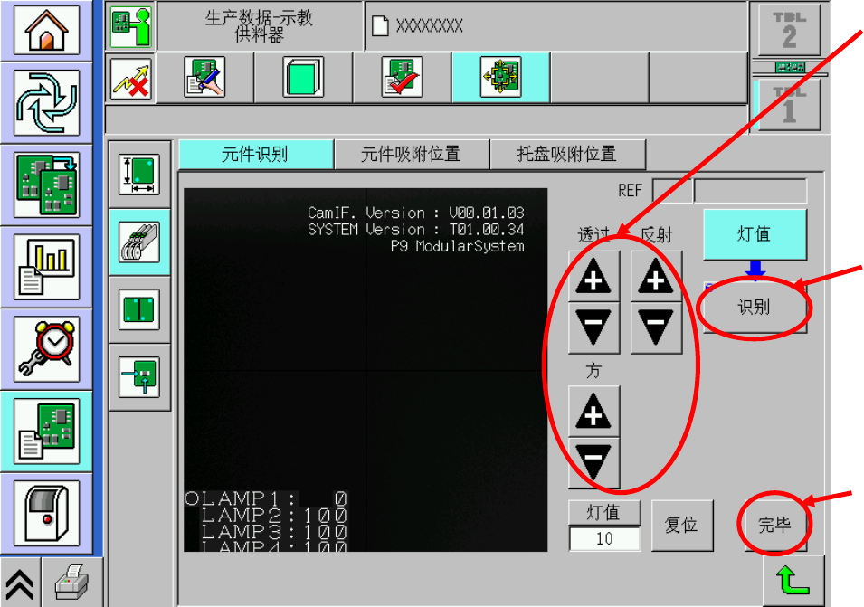6 使灯的值上下增减,调 整光度,以使元 件的轮廓变清楚。 7 按 [ 识别 ] 。 • 进行识别动作。 ∗ 请确认识别结果栏是否 已变成 ‘ANS = 100’ 。 8 按 [ 完毕 ] 。 • 弹出是否保存数据的确 认窗口。选择 [ 是 ] ,将会 保存数据,返回原来的画 面。