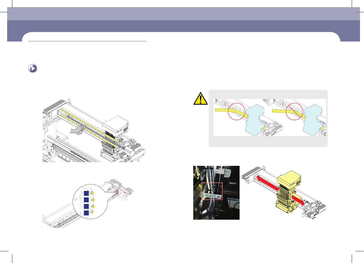每月检验 Chap ter 5 Nex t Generation, Multi - Functi onal Placer DE CAN S 1 M ain te na nc e Ha n db oo k 5-1 2 X Frame LM Guide,Ball Screw清扫及注油 每月检验 Step 5. 把 Head assembly 尽量 移动 到 右 侧 Step 6. 利用 六 角扳 手( M3 ) 按照下图所示顺 序 把用来固…