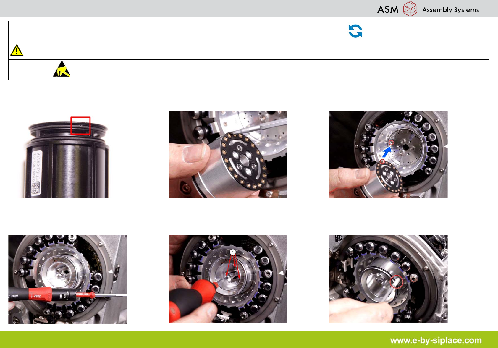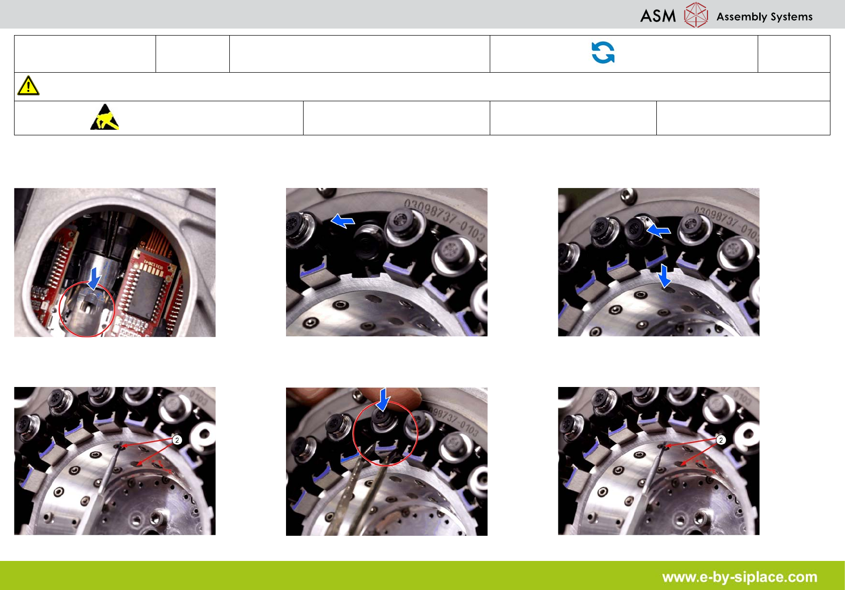 E-by SIPLACE CP14 插入 DP 驱动 部件更换 2/2 注意 使用贴片机前,请参阅用户手 册中的安全须知。 遵守防静电守则 工具: 易损件: 耗材: 7. 取下 DP 更换工具。 8. 从内部将乙 醇涂抹在软管上。 这样会使与星 型轴盤架的接合更为容易。喷 嘴并非直接可 见。 9. 小心!小心切勿弯曲或 损坏软管。 使用镊子 连接软管 (2) 与 DP 驱动 (1) 。 10. 按压印制板与接头 。 11. 使用 0.1…