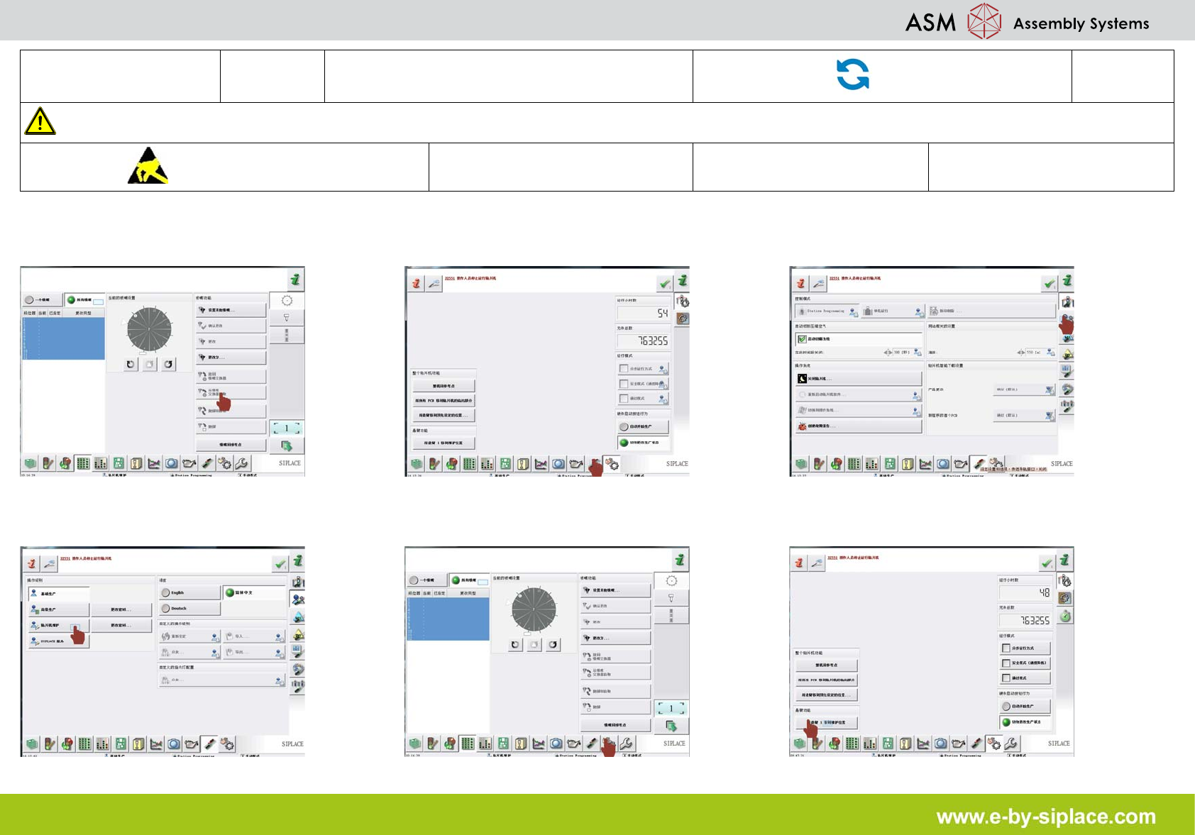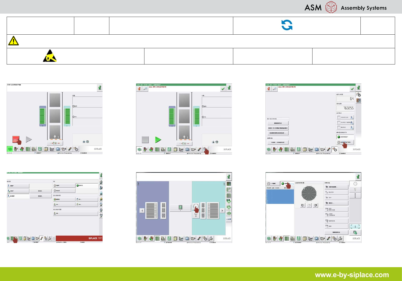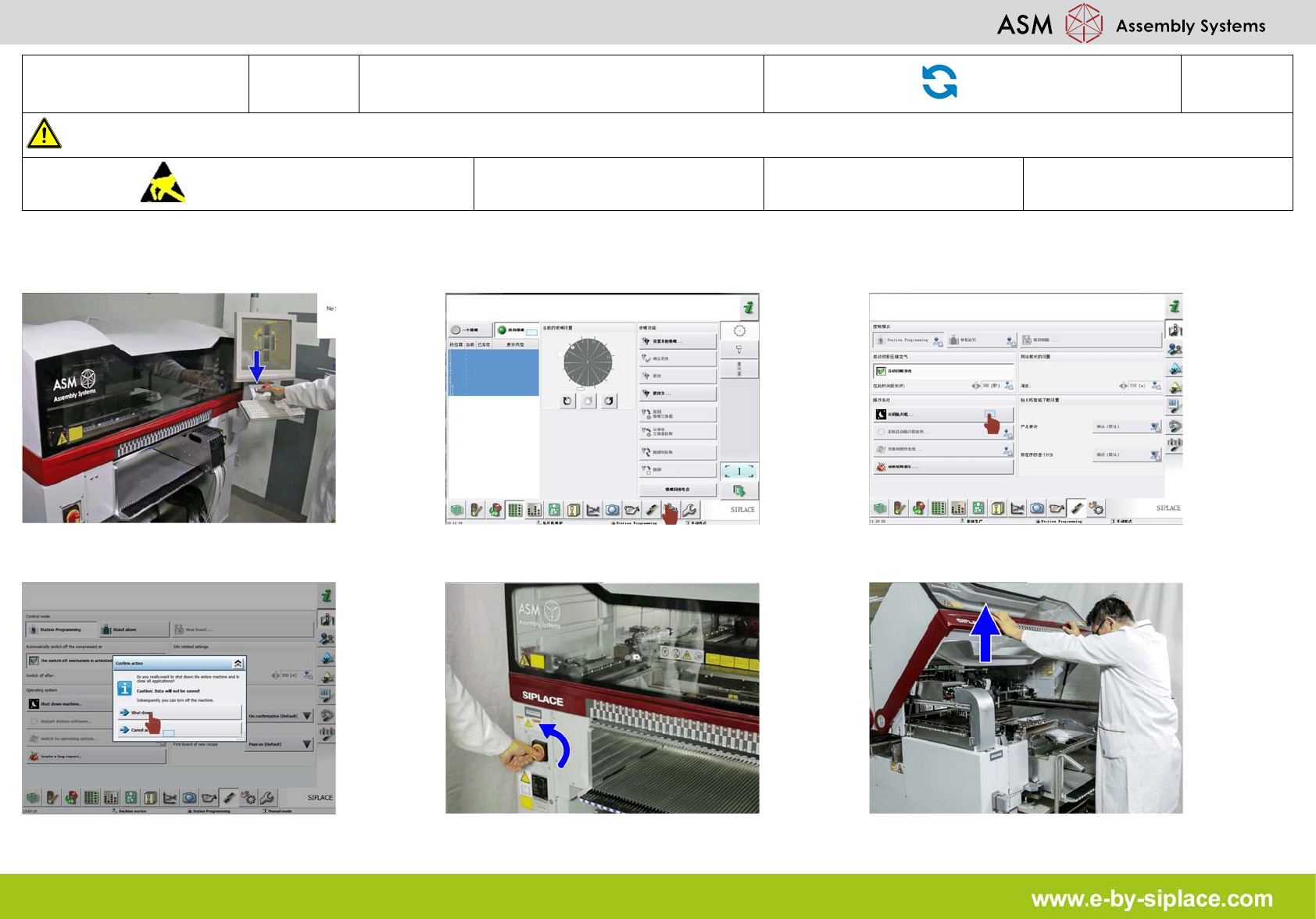 E-by SIPLACE CP14 放回吸嘴并关闭贴片机 部件更换 2/3 注意 使用贴片机前,请参阅用户手 册中的安全须知。 遵守防静电守则 工具: 易损件: 耗材: 7. 单击 “ 返回吸嘴交换器 ” 图标 。 8. 单击 “ 设置选项传送导轨接口与关闭 ” 图 标。 9. 单击 “ 检查并设置用户设置 ” 图标。 10. 单击 “ 贴片机服务 ” 图标。 11. 单击 “ 贴片机的传感器与功能 ” 图标。 12. 单击 “ 将贴片…