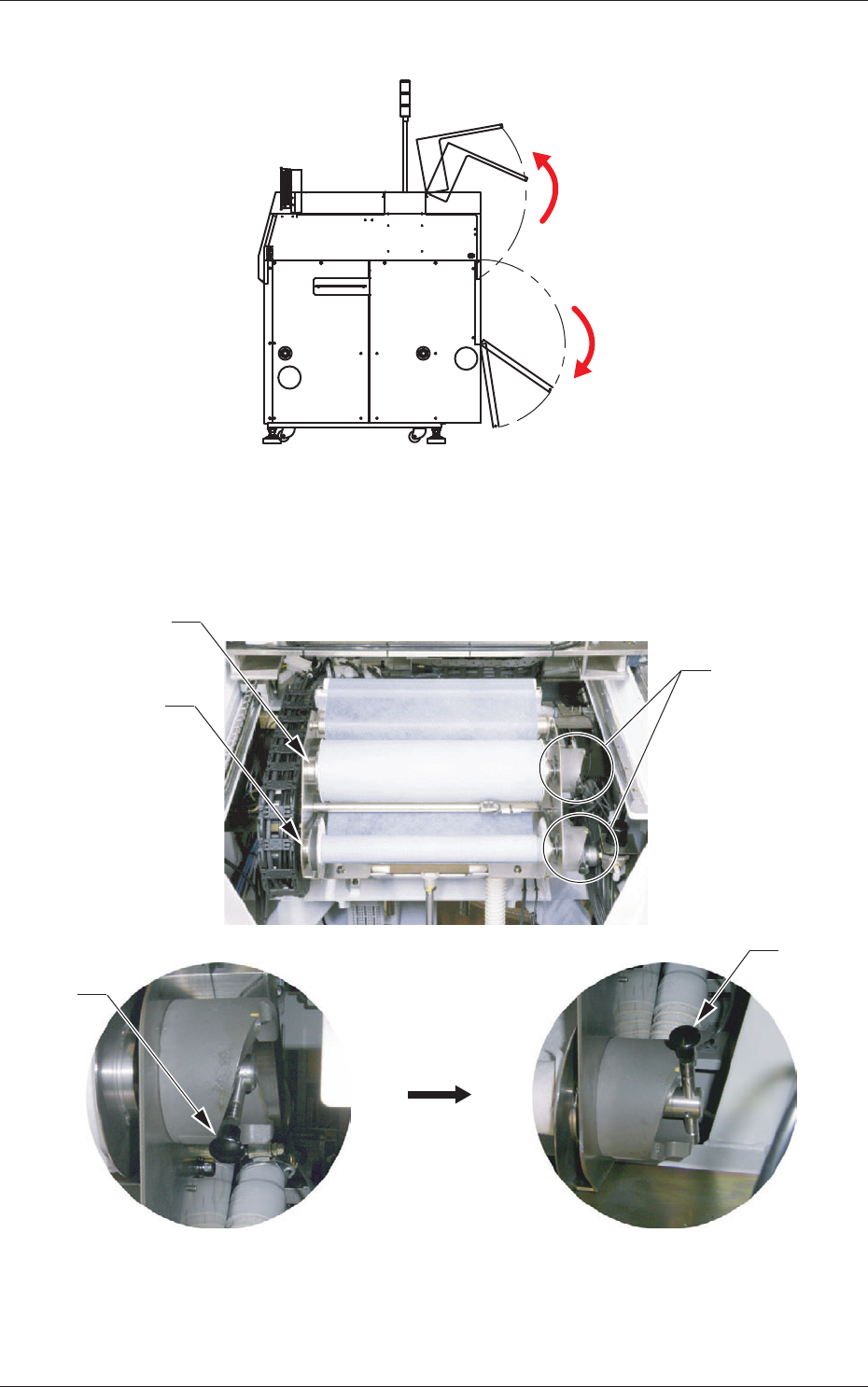 1 - 45 Tg 1300 -ID-MT 4.3 クリーニングペーパー交換方法(クリーニングペーパー幅変更方法) 0607 - 002 (6) 後面側の開閉扉(2 か所)を開きます。 Fig.4A65 (7) 巻取り側のロールと供給側のロールのレバーを押上げ、各ロー ルを手前に引き出してクリーニングユニットから取外します。 供給側ローラ 巻取り側ローラ レバー レバーを上げる レバー レバー Fig.4A66