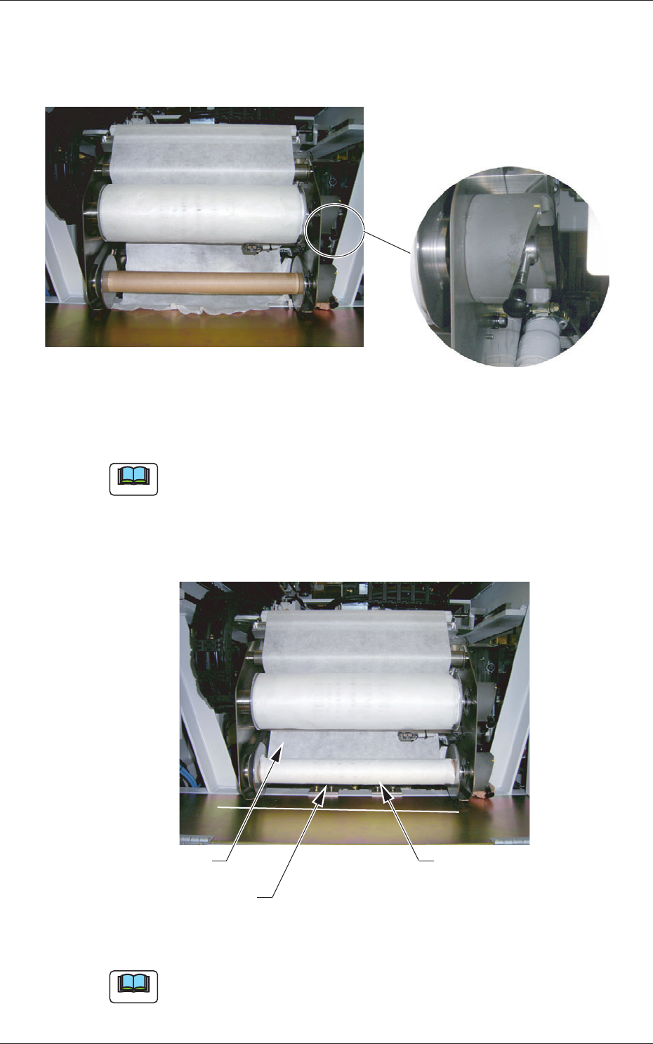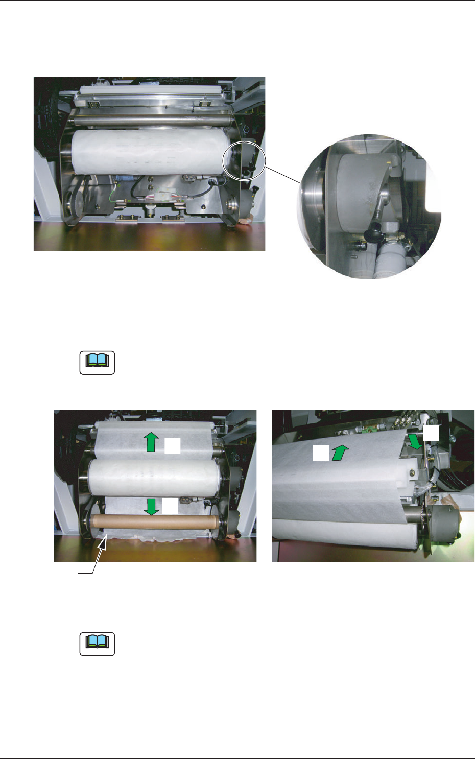 1 - 48 Tg 1300 -ID-MT 1004 - 003 4.3 クリーニングペーパー交換方法(クリーニングペーパー幅変更方法) (12) クリーニングユニット左側フランジのピンに、左側アダプタの 切欠きがはまるように巻取り側ローラを支えながらレバーを押 し下げて巻取り側ローラをセットします。 レバー押し下げ状態 Fig.4A71 ノート 右側アダプタはロール芯から抜け落ち易いので右上に傾けた状態で セットしてください。 (13…
