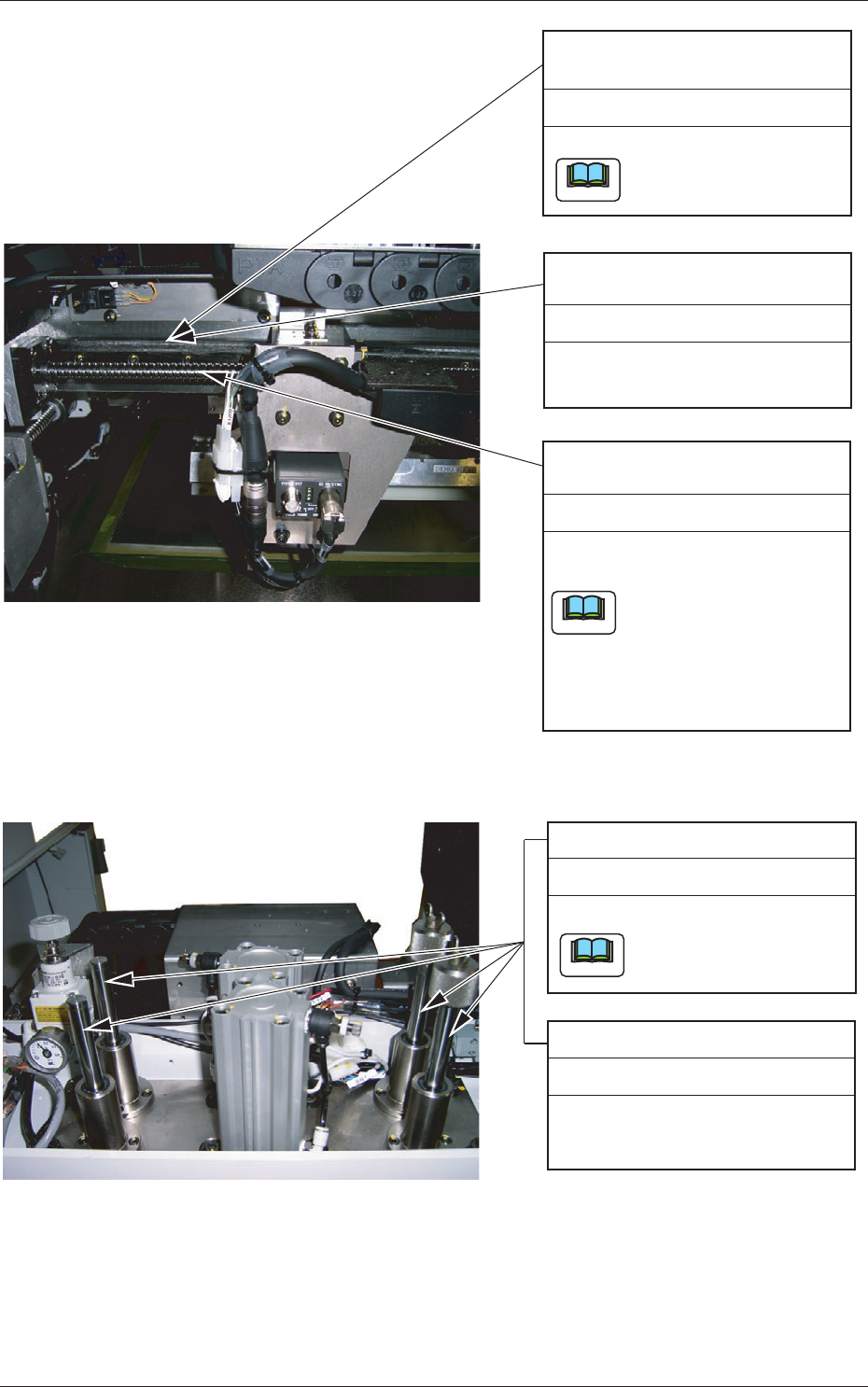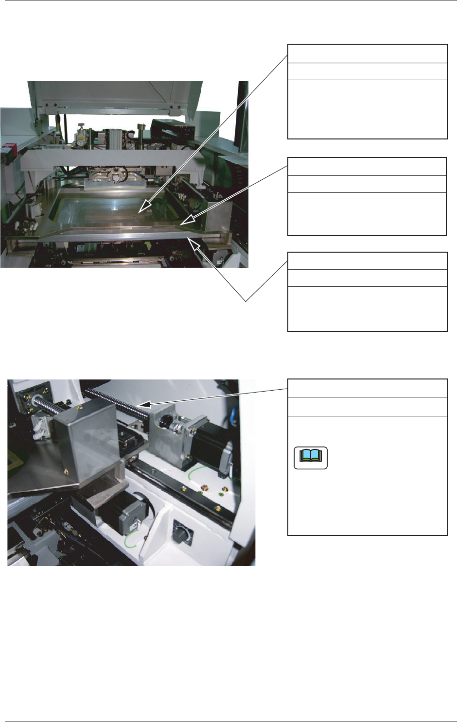 1 - 18 Tg 1300 -ID-MT 3.3 点検、清掃、給油か所 スクリーン認識X軸 リニアガイド 6か月ごと 給油 スクリーン認識X軸 ボールネジ 6か月ごと 給油 ハケまたはヘラでグリースを 塗布してください。 リニアガイド 油ウエスで清掃してください。 毎月 清掃 ノート 糸クズなどを残さないよ うにしてください。 スクリーン認識X軸 ハケまたはヘラでグリースを 塗布してください。 グリースを大量に塗ると基 板上やスクリー…