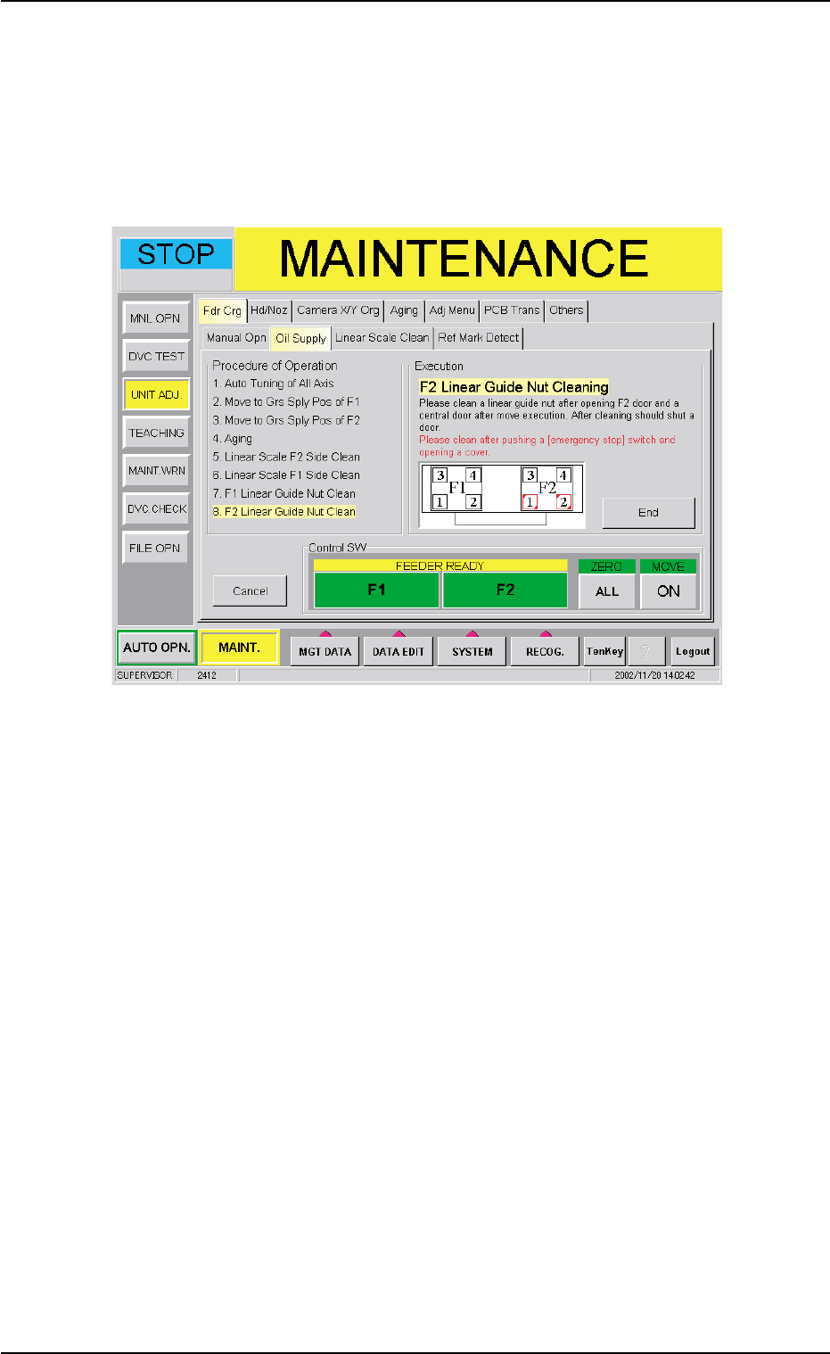 (23) Press the [EMERGENCY STOP] switch and open the F2 and cen-