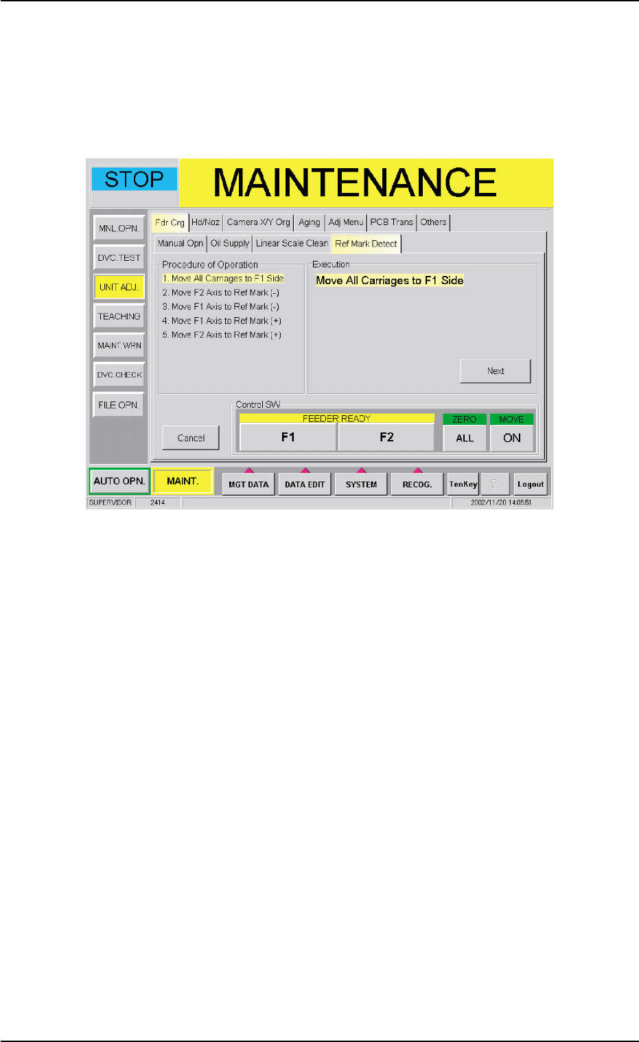 021 1-004 1-76 AGS01ETRP 1.4 Maintenance Method (25) Confirm whether the reference mark on the linear scale can be detected or not. (25-1) When the "Ref Mark Detect" tab is pressed in the "Fdr Crg." t…