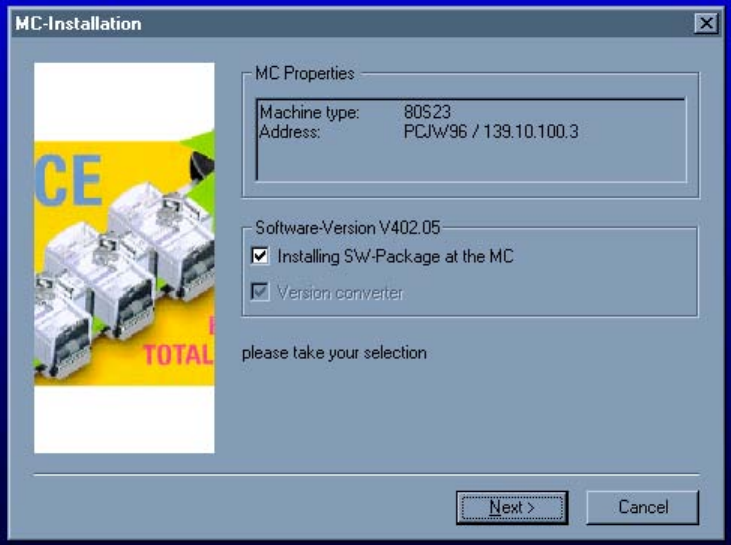 • Installing SW-Package at the MC (menu option activating the MC installation)