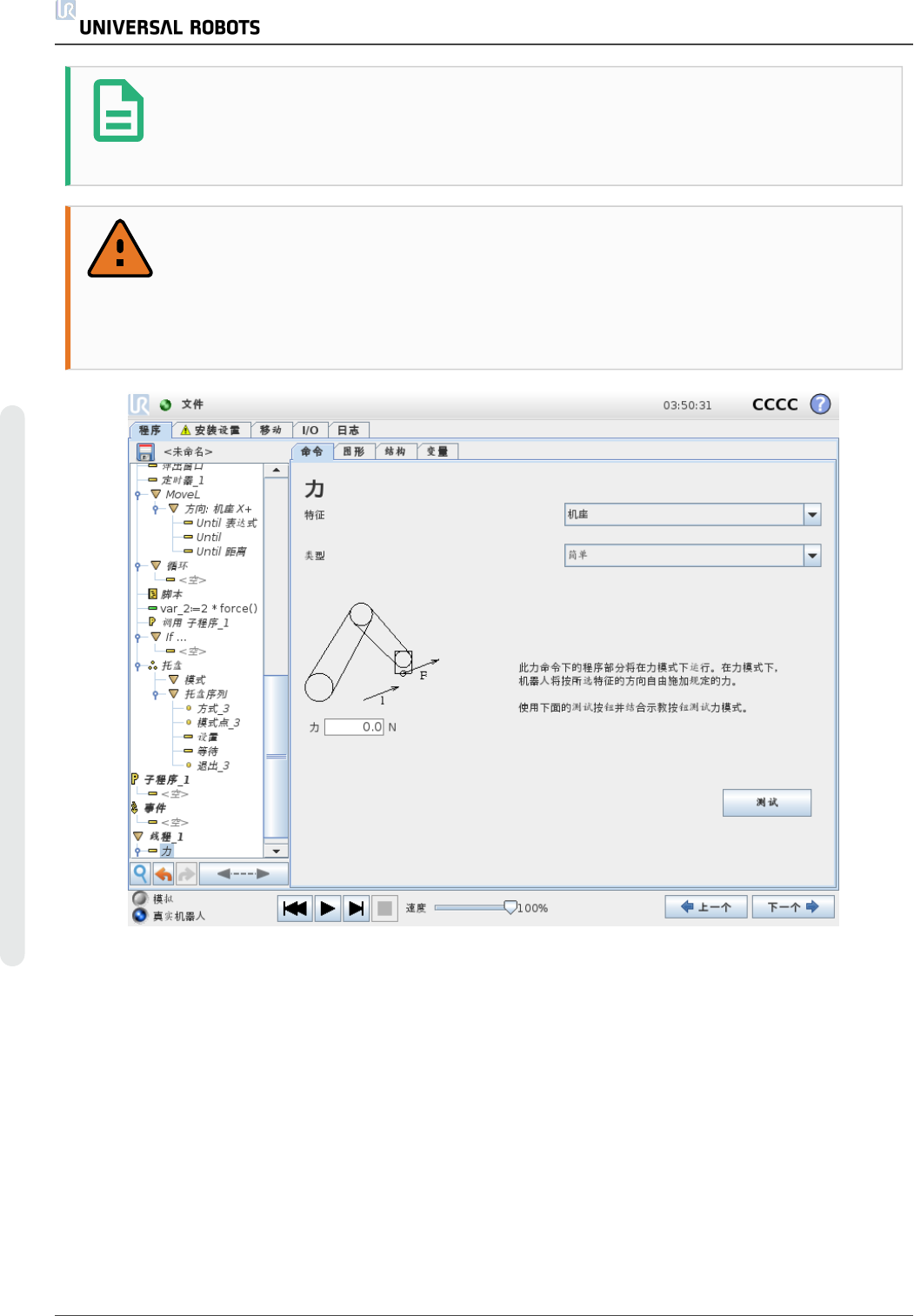 提 示 如 果 If 、 E l s eIf 或 Loop 中 含 有 力 节 点 , 并 且 选 择 了 “ 连 续 检 查 表 达 式 ” 选 项 , 则 可 以 在 表 达 式 的 末 尾 添 加 一 个 end_fo rce _mod e() 脚 本 来 退 出 力 控 制 。 警 告 1. 在 进 入 力 模 式 之 前 避 免 高 减 速 度 。 2. 在 力 模 式 下 避 免 高 加 速 度 , 因 为 它 降 低 了 …