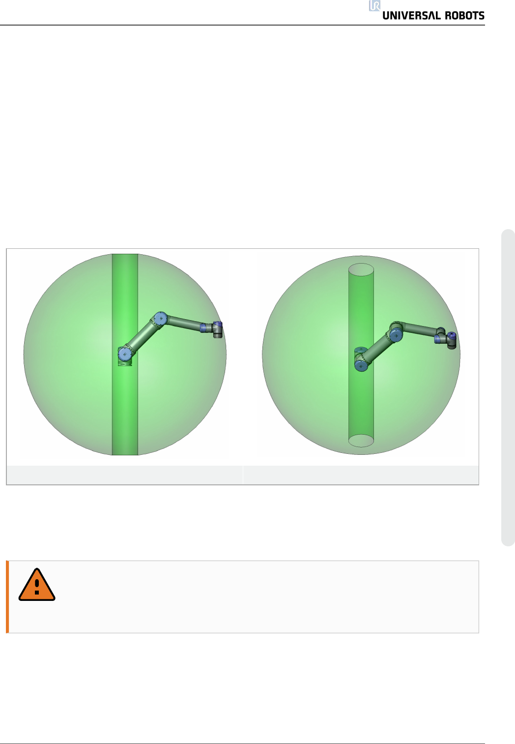 虑机器人正上方和正下方的圆柱体空间。尽可能避免将工具移向圆柱体空间,因为这样会造