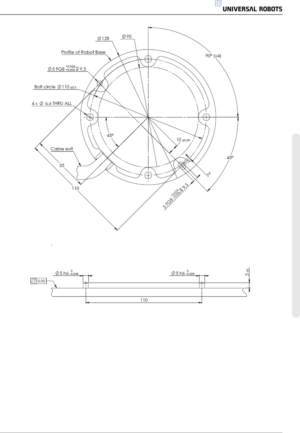 使用四颗 M6 螺栓,通过机器人机座上的四个 6.6mm 孔来安装机器人手臂。建议以 6.5Nm 扭