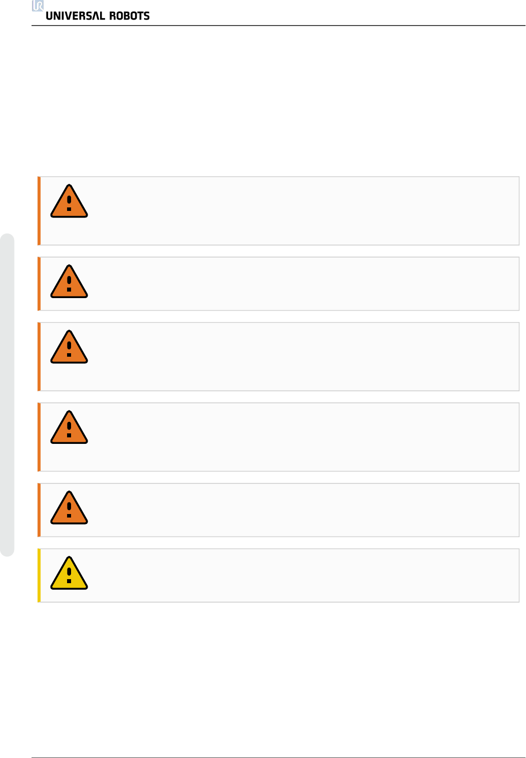 警 告 您 必 须 按 照 1.8. 机 械 接 口 在 本 页 21 和 1.9. 电 气 接 口 在 本 页 27 章 节 中 的 规 范 和 警 告 安 装 机 器 人 与 所 有 电 气 设 备 。 警 告 1. 确 保 机 器 人 手 臂 和 工 具 / 末 端 执 行 器 都 正 确 并 稳 固 地 用 螺 栓 固 定 在 位 。 2. 确 保 机 器 人 的 手 臂 有 足 够 的 空 间 来 自 由 活 动 。 3. 确…