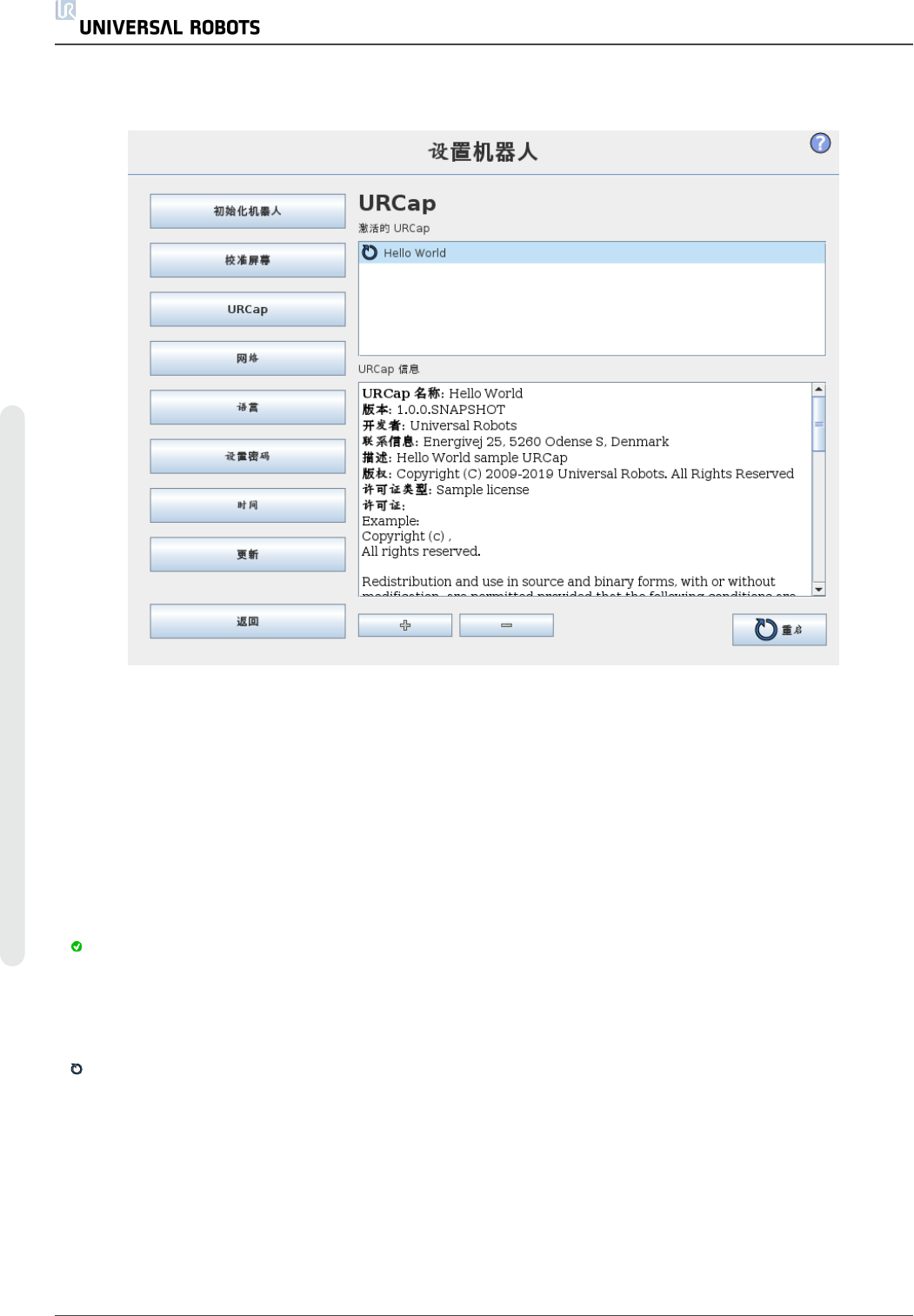 相应的条目。新安装或卸载的 URCap 要求重启 PolyScope,“重启”按钮将会启用。