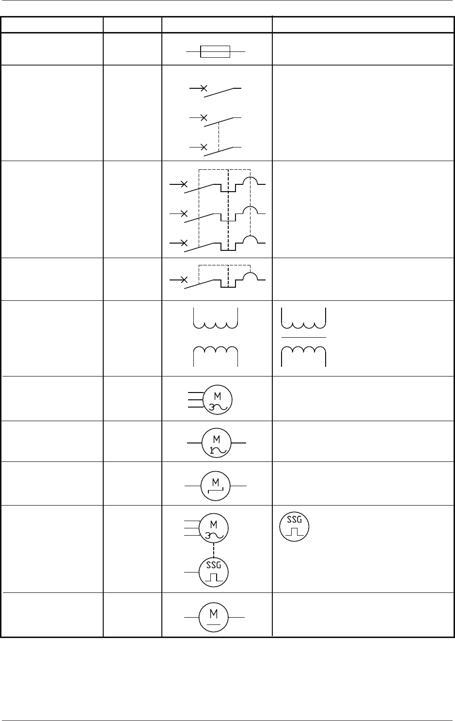 4-3 5OM-1750 1303-001 電気回路図で使用する記号 名 称 記 号 図 記 号 備 考 ブレーカ サーキットブレーカ サーキットプロテクタ トランス 3 相交流モータ 単相交流モータ 冷却ファン ステッピングモータ サーボモータ DC モータ M M M M M T Q Q 本装置では鉄心入りのトラ ンスを使用しているため、 左図のように表記してい ます。 左図はエンコーダを表します。 気中遮断器 ヒューズ F (a)…