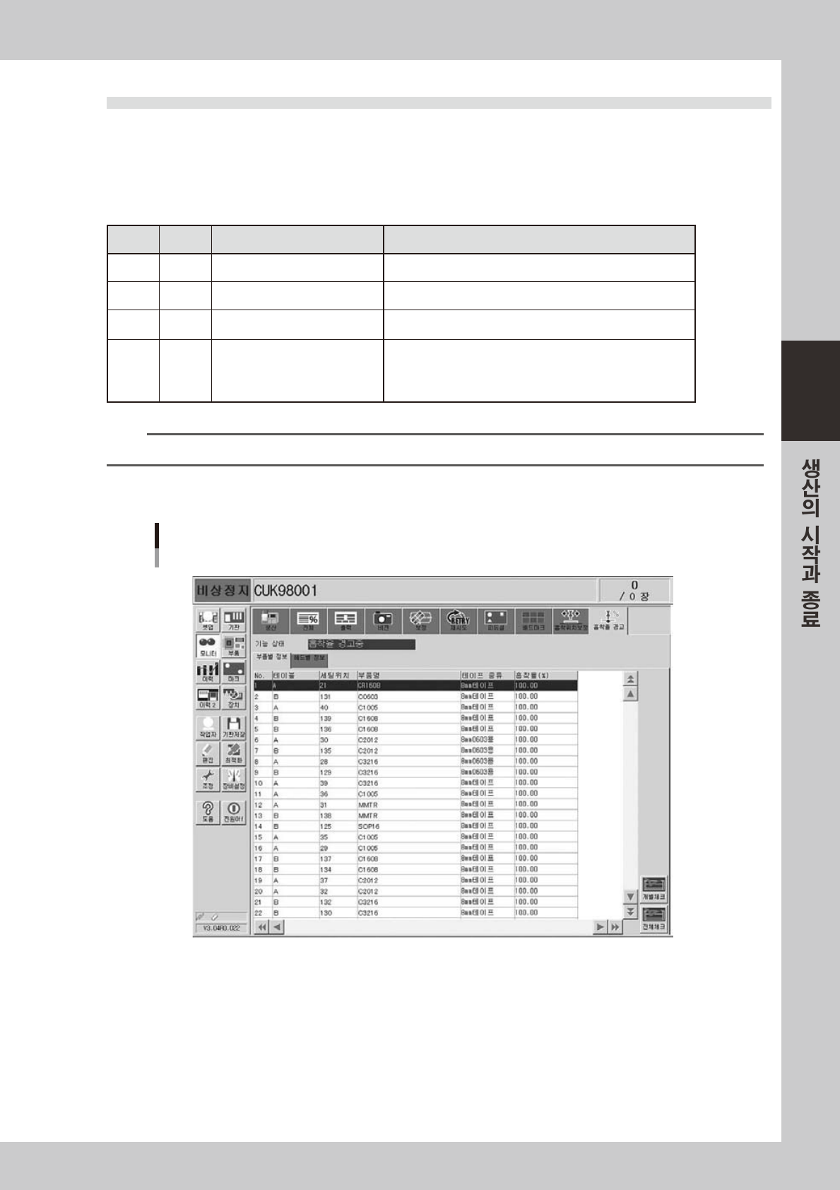 흡착율에이상이생긴부품 (「적색」으로표시된행 ) 중에서임의의부품 ( 행 ) 을선택하여 ,이버튼을누르면 ,그부품