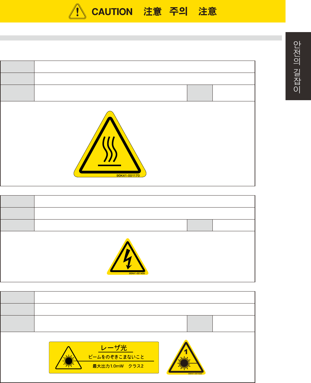 xvi 위험의 결과 장비를 파손시키 거나 , 다 칠 우려가 있습니다 . 위험의 회피 제 품 ( 장치 ) 을 취급하 기 전에 반드시 메뉴얼을 읽고 , 내용 을 숙지한 후에 사 용할 것 . 대상 YS 시리즈의 모든 장비 적용 단계 모든 경우 위험의 결과 방 사선에 노출 될 위험성 이 있습니다 . 위험의 회피 반드 시 커버를 닫 고 운 전할 것 . 대상 YS i -X 적용 단계 모든 경우 위험…