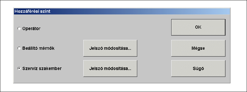 Az "Operátor", "Beállító mérnök" és "Szerviz szakember" áll a választáshoz rendelkezésre.
