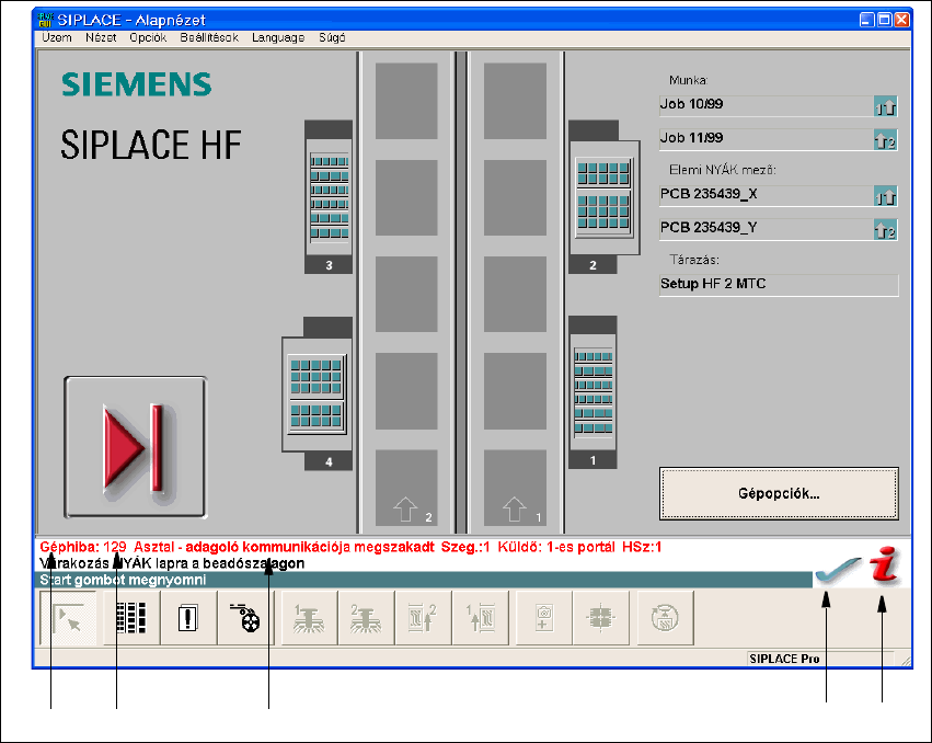 5 Hibainformáció SIPLACE SR.504.xx szoftver útmutató 5.2 Hibainformációk lehívása Kiadás 01/2003 54 5 Ábr . 5.2 - 1 Alapnézet hibaüzenettel Szövegmagyarázat az 5.2 - 1 ábrához (1) Hibafajta (Sáv-, Gépek-, T ovábbítási hi…