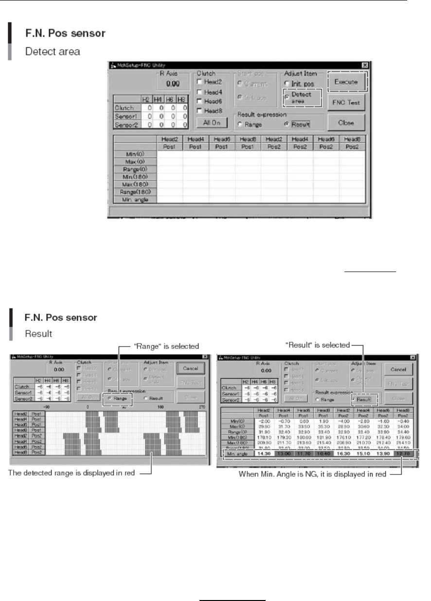 Y AMAHA Xg 高级维护指导 Step3 检查结果。 1. 首先传感器检测形态在图框中显示出来,红色的区域为检测到的范围。 2. 同时结果也显示出来,如果最小值在 13-17 之间,直接进入 3.FNC测试. 如果最小值大于 13-17, 则 F.N. 位置传感器需要进行调整, 请参照 4.2 进行 调整。 3.FNC测试 Step1 确认吸嘴与其它部分没有干涉。 Step2 打开 FNC 调试界面,按下[FNC Test]键。 …