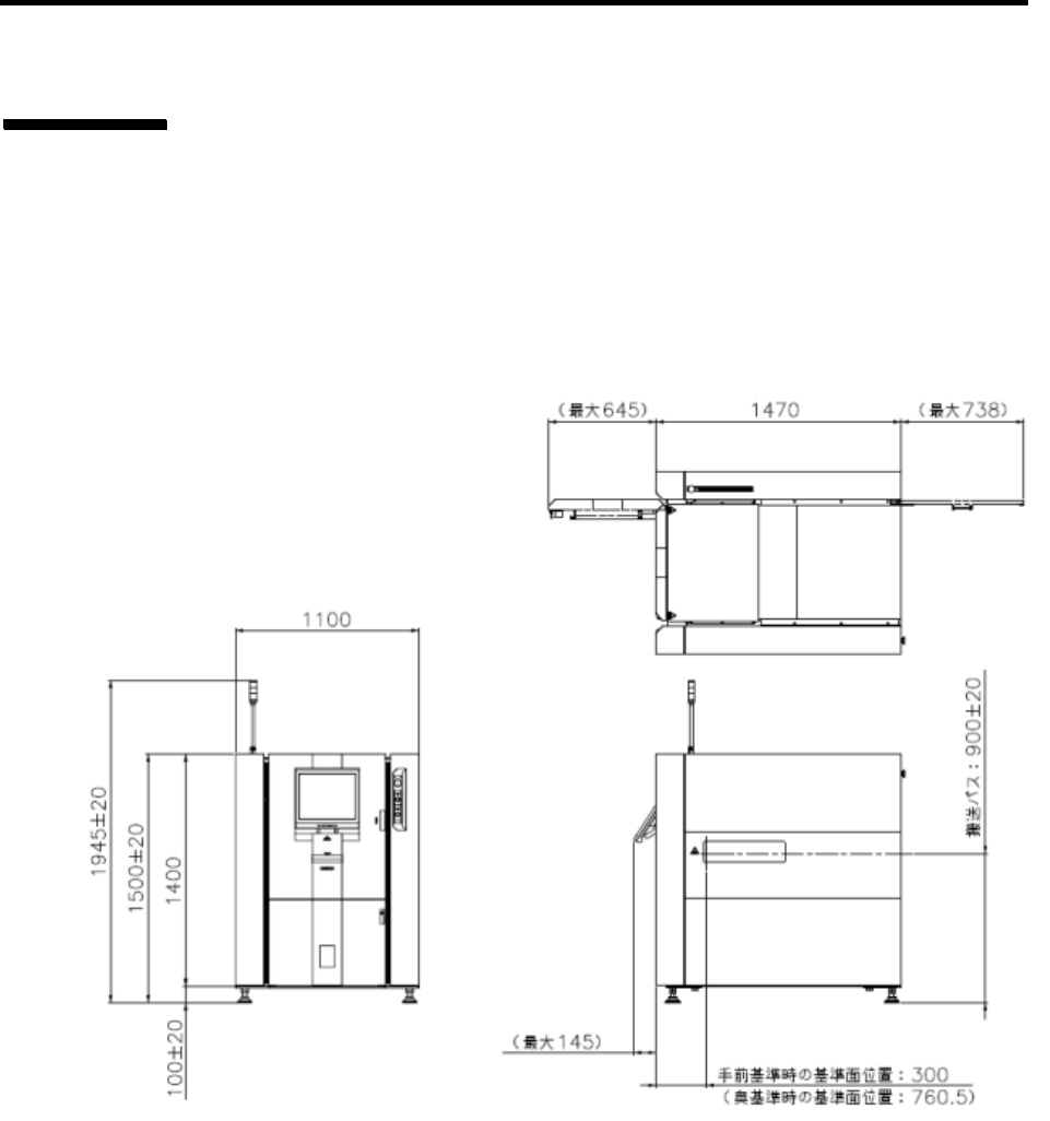 2 . 装置规格 2-1 2. 装置规格 对本装置的通用规格及 检查对象基板 进行说明。 2.1 通用规格 外观尺寸 外观尺寸如下。 (単位: mm 公差: IT16 )