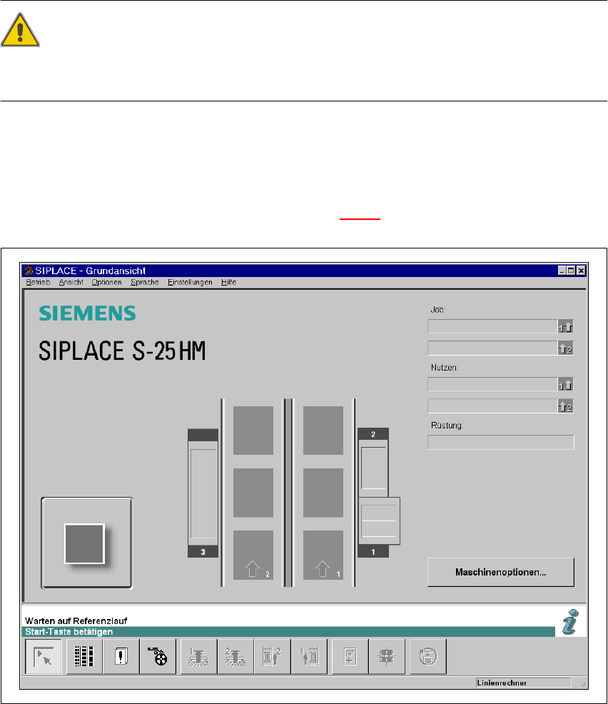 3 Was ist zu tun ... Betriebsanleitung SIPLACE S-25 HM 3.1 SIPLACE-Linie einsc halten Softwareversion S R.502.xx Ausgabe 01/2001 D E 96 3.1 SIPLACE-Linie einschalten 3.1.1 Linienrechner einschal ten / Bedienoberfl ä che …