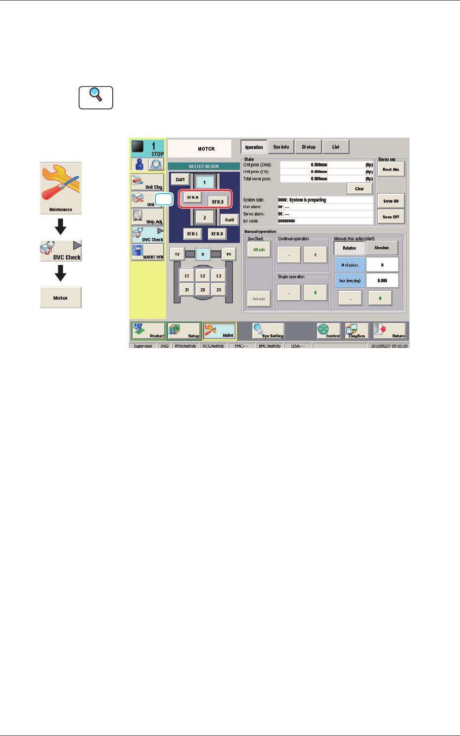 18 OM-1683 10. "MOTOR" Window This window enables you to perform a manual operation (inching) of each unit and view the current system information. Reference Refer to "6.2 "MOTOR" W indow" i…