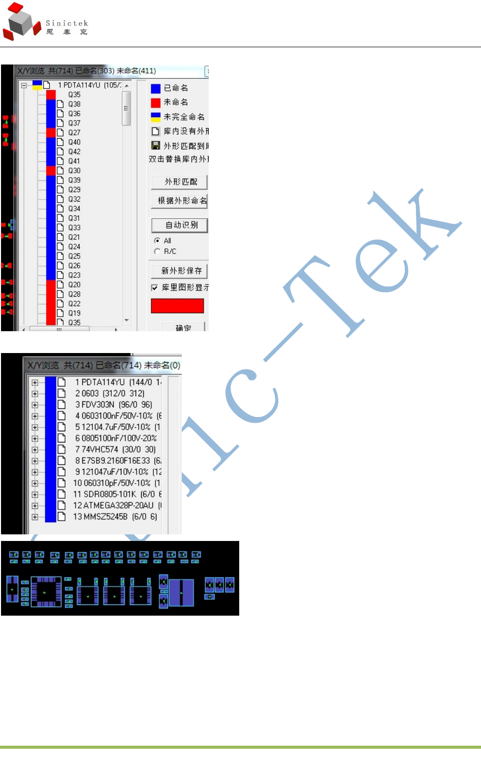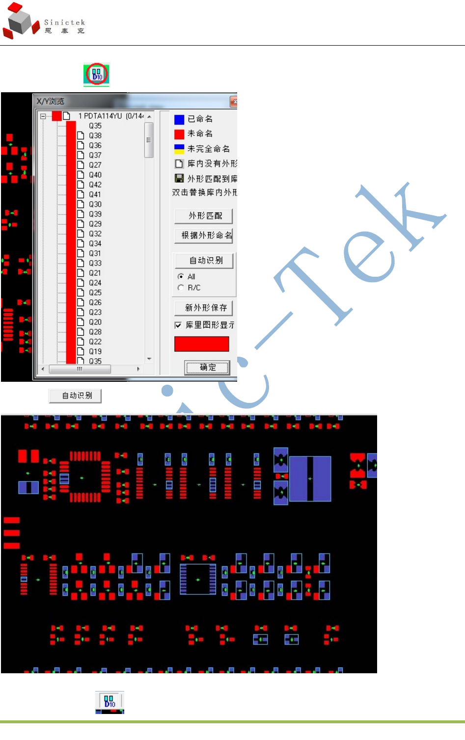 3D_SPI 操作手册 厦门思泰克智能科技股份有限公司 1 4 / 7 9 Xiam en Sinictek Intelligent T echnology Co., Ltd. 4.1.6 元件命名 选择元件命名的 出现下图 然后选择 出现下图 这里非 chip 类的元器件可能会合并错,所以这时需要我们手动去合并 选择上方工具栏的 , 然后去框选单个 X/Y 数据和其对应的焊盘, 当有 X/Y 没有合并时,