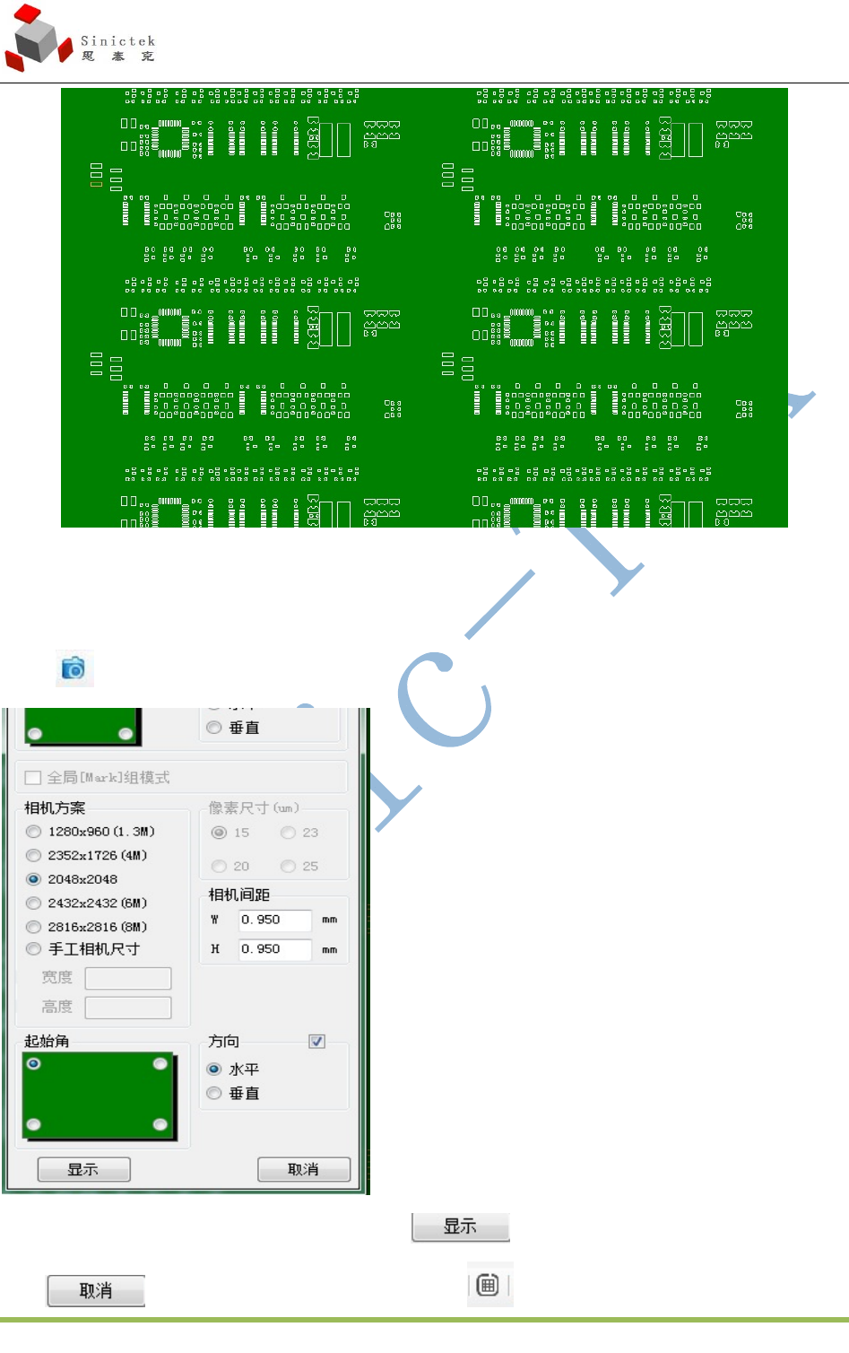 3D_SPI 操作手册 厦门思泰克智能科技股份有限公司 X i a m e n S i n i c t e k I n t e l l i g e n t T e c h n o l o g y C o . , L t d . 21 / 79 4.2.6 路径优化 点击 出现如下图,相机方案和相机间距一般默认即可: 选择 FOV 的起始角和 FOV 走动的方向后点击 ,确认 OK 后 选择 出现下图。取消显示 FOV 走位点击 。