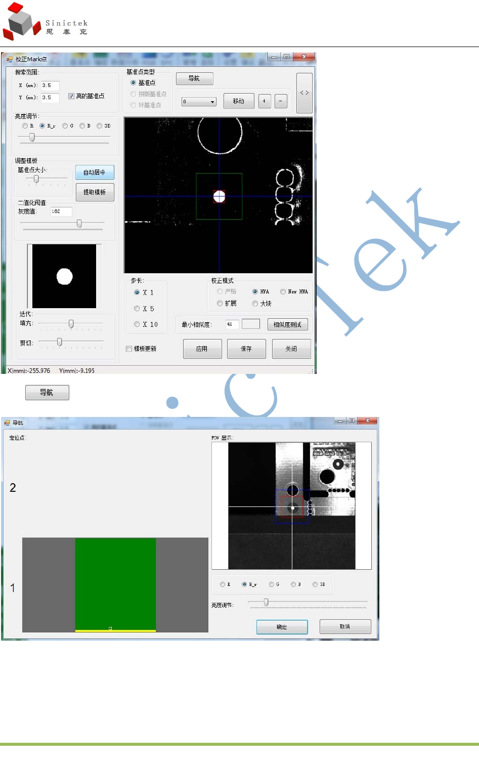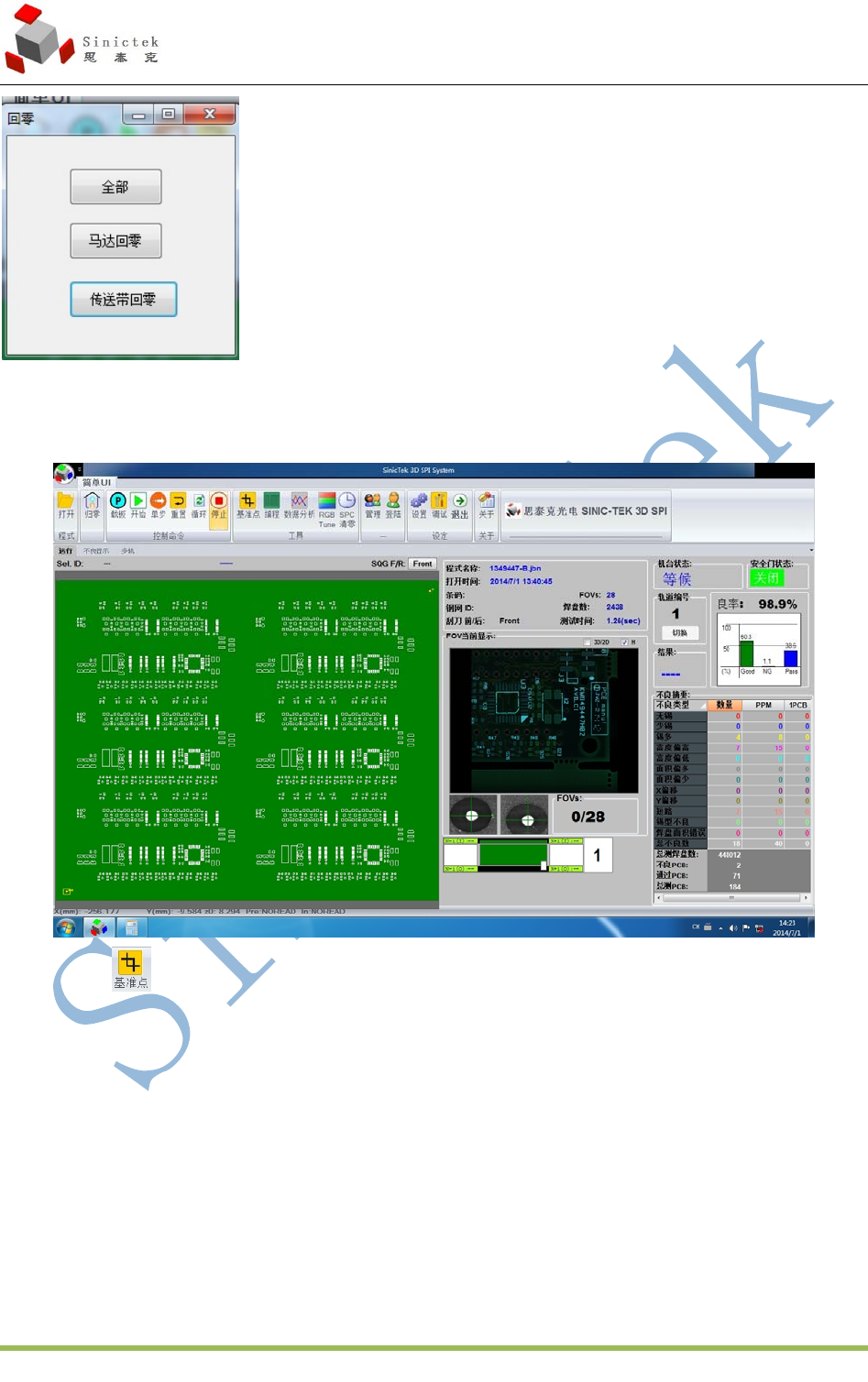 3D_SPI 操作手册 厦门思泰克智能科技股份有限公司 2 4 / 7 9 Xiam en Sinictek Intelligent T echnology Co., Ltd. 选择归零后机台状态为回零,当机器状态变成等候时回零结束 4.3.5 调整基准点 在机器轨道上放一块PCB点击开始,PCB会停到停板位,因为找不到Mark机台停止 打开基准点 ,选择调整同步点后出现下图