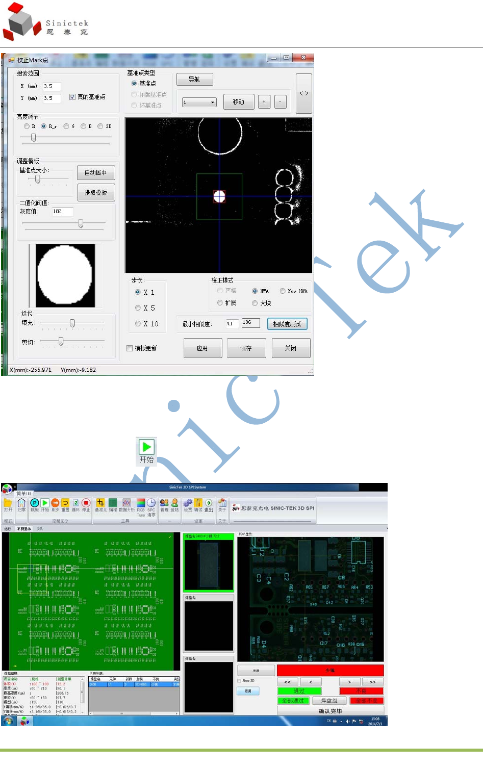 3D_SPI 操作手册 厦门思泰克智能科技股份有限公司 2 8 / 7 9 Xiam en Sinictek Intelligent T echnology Co., Ltd. 选择 出现下图 选择整板 后出现下图 打开 导入之前的参数或者调整RG B三种光的上下限,调整完后观察