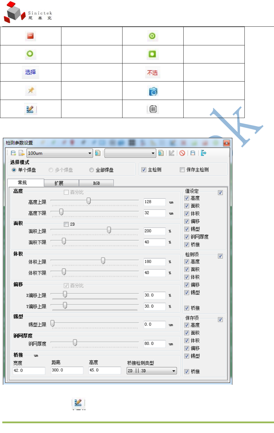 3D_SPI 操作手册 厦门思泰克智能科技股份有限公司 3 8 / 7 9 Xiam en Sinictek Intelligent T echnology Co., Ltd. 选中右侧值设定中的项目左侧对应的变为可修改,然后可以设置选中项目的参数 参数设置完毕后,在检测项中选择检测时需要检测的内容。 保存项中选择相应的项目确认检测项中修改。 值设定:只是设定某个或多个项目的参数,并不决定设定的项目检测还是不检测。 检测项:选择检测时需…