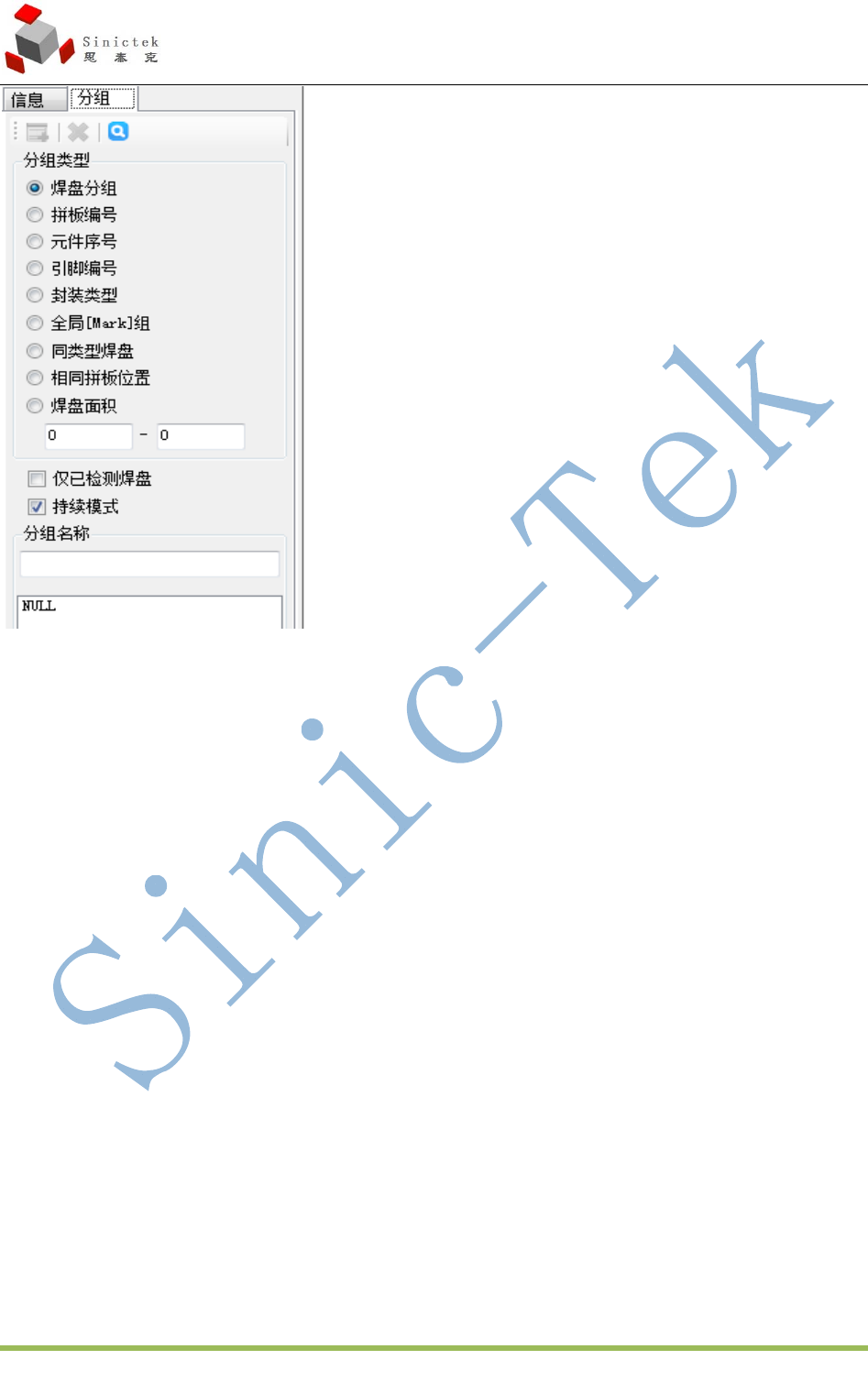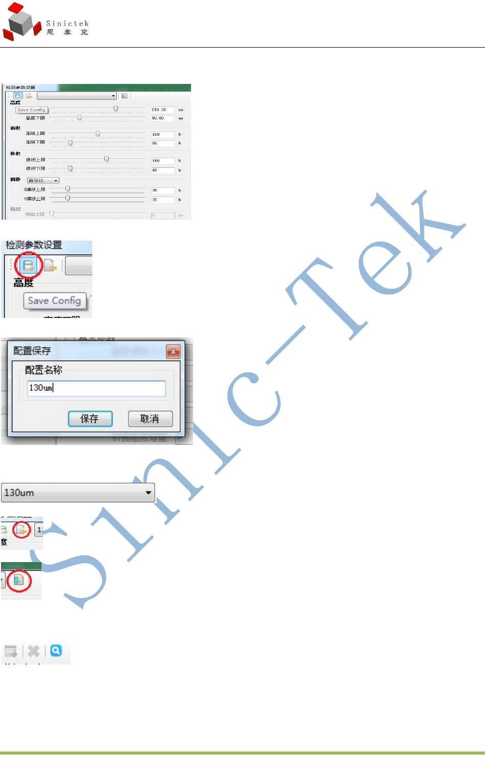 3D_SPI 操作手册 厦门思泰克智能科技股份有限公司 4 2 / 7 9 Xiam en Sinictek Intelligent T echnology Co., Ltd. 5.2.4 其他功能介绍 在检测参数设置界面中 当检测参数设置成功后可以选择 Save Config 选择后跳出配置保存画面 输入配置名称(通常以钢网厚度命名)选择保存 通过下拉菜单选择需要调用的配置 删除选择中的配置 导入选择中的配置。 分组功能如下: 新建,…
