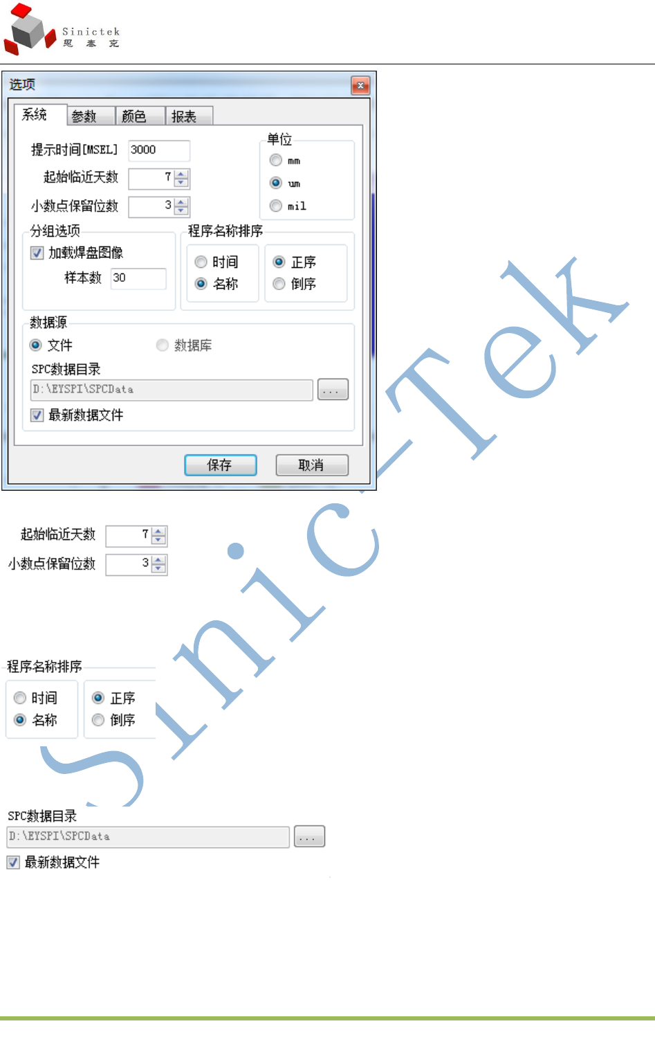 3D_SPI 操作手册 厦门思泰克智能科技股份有限公司 X i a m e n S i n i c t e k I n t e l l i g e n t T e c h n o l o g y C o . , L t d . 63 / 79 起始临近天数:列表视图起始时间设定 小数点保留位数:与单位对应数据小数点保留位数。 程序名称排序:列表视图中 程序名称按照如下规则排序 SPC 数据目录:数据对应的目录 最新数据文件:打勾代表把当…