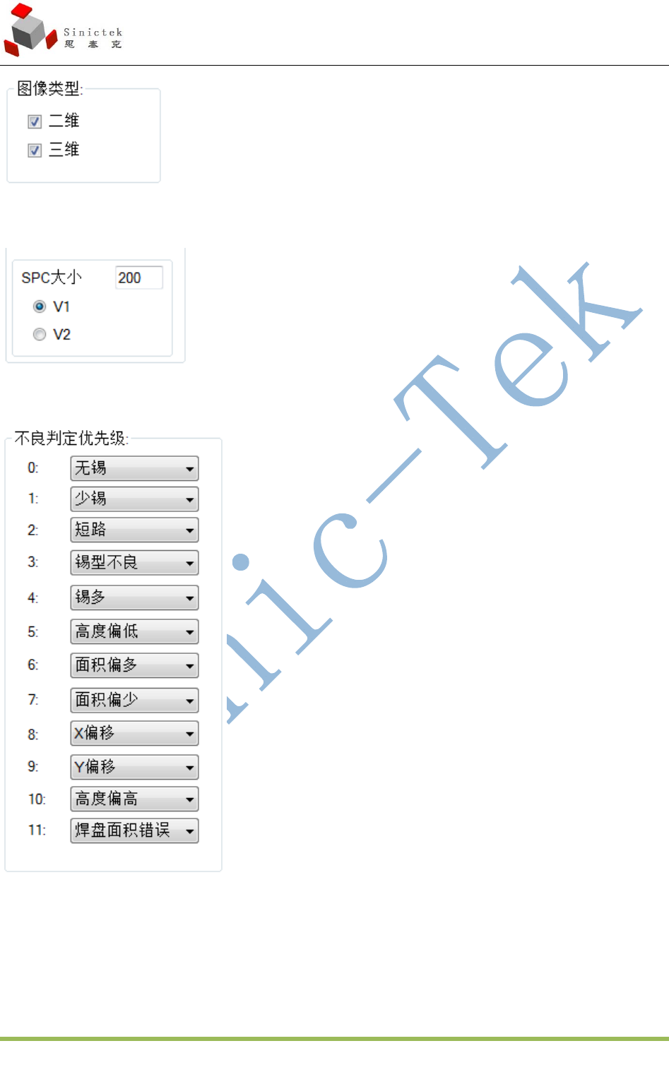 3D_SPI 操作手册 厦门思泰克智能科技股份有限公司 6 4 / 7 9 Xiam en Sinictek Intelligent T echnology Co., Ltd. 5.4 UI 设置 5.4.1 检测 数据保存:勾上后保存测试数据,否则不保存。 图像:选择全部,保存所有图像;选择不良,只保存测试不良的图像;选择良好,只保存 良好的图像。