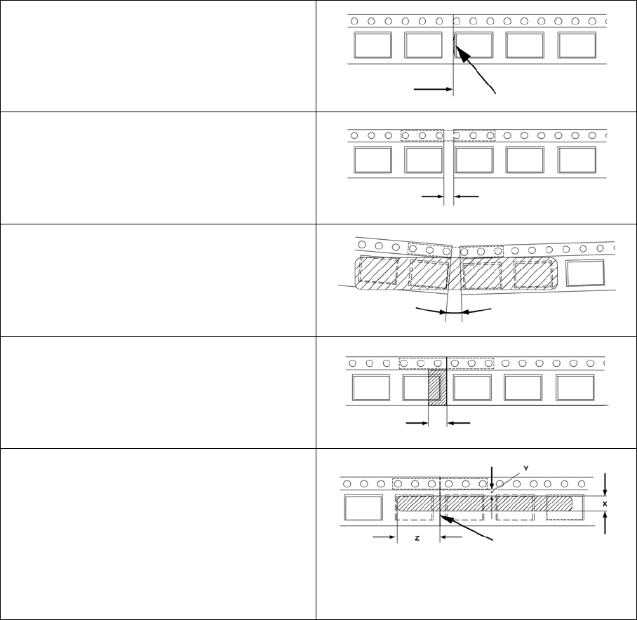 Accessories Connecting the Tapes Tape Splice Tool for SMD Tape Connections User Manual SIPLACE S-Feeder 103 6.1.6.3 Checking the Join: Examples of Incorrect Connections Component pocket is cut open Gap betwee n the tape …