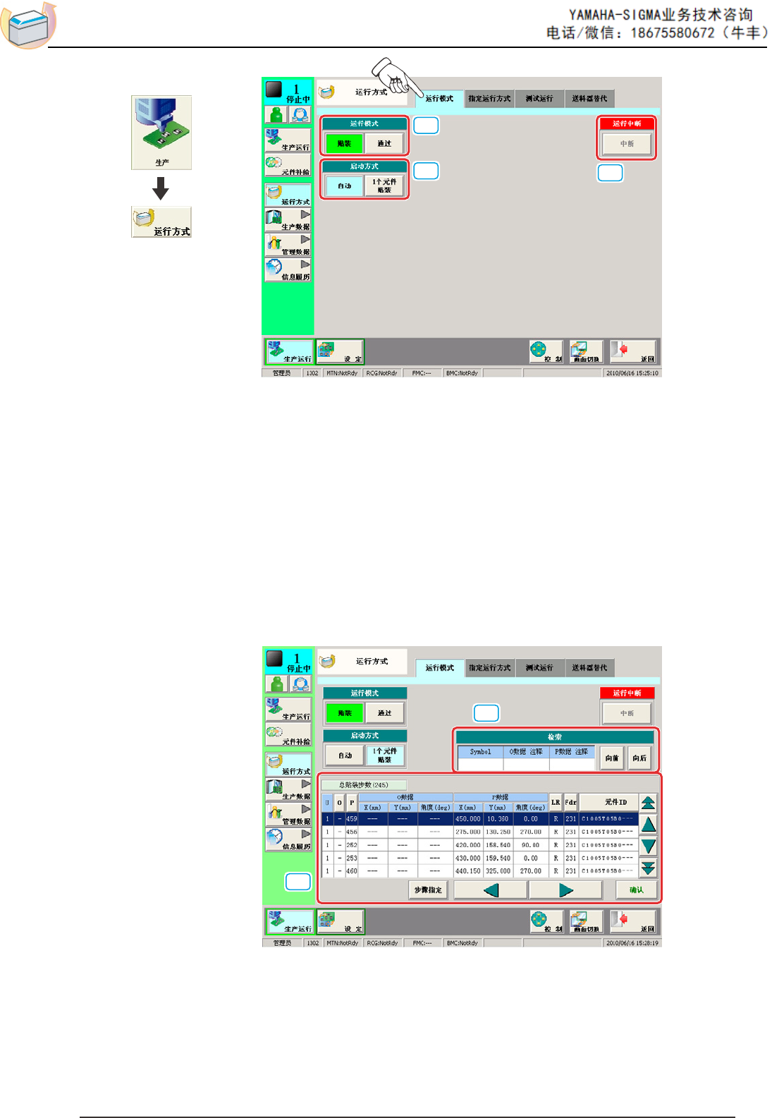 -9- • 在 “ 允许热启动开始 ” 状态下的 “ 运行模式 ” 界面 在生产运行中中断装置运行,便进入可以进行热启动的状态,并显示 “ 热 启动开始 ” 界面。 [1] [2] [1] [最后贴装位置移动 ] 按钮 按该按钮,便移行到 “ 热启动开始 ” 界面。 [2] [热启动中断 ] 按钮 中断热启动。 • “ 补装可能 ” 状态的 “ 运行模式 ” 界面 若吸取前发生吸嘴确认异常,便可进行补装并显示 [ 补装 ] 按钮…