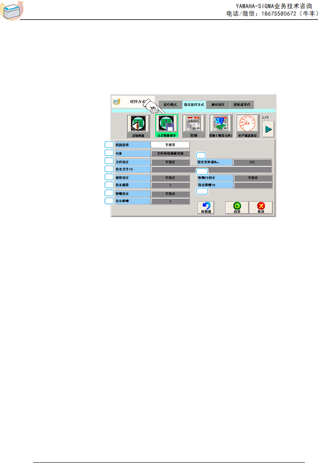 -12- 3.2.2 认识 ( 识别 ) 图像保存 在 “ 指定运行方式 ” 选项卡中,按下 [ 认识图像保存 ] 按钮,便显示以下界 面。 为了在以识别异常界面为对象的异常原因的分析中使用,设定识别图像的保 存模式数据 ( 对象、条件 )。 将机能选择设定为 “ 保存 ” ,以与运行中的保存模式 ( 对象、条件 ) 一致的 识别异常界面为对象,保存在装置内的存储器中。 [1] [2] [3] [5] [6] [7] [8] …