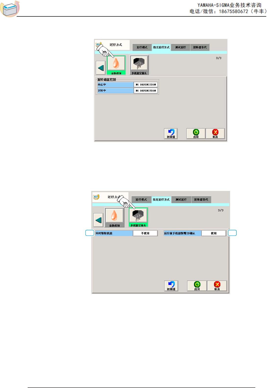 -22- 3.2.11 涂助焊剂 ( 助焊剂涂敷 ) 在 “ 指定运行方式 ” 选项卡中,按下 [ 涂助焊剂 ] 按钮,便显示以下界面。 使用助焊剂涂敷单元 ( 选购件 ) 时设定。 3.2.12 多机能 ( 多功能 ) 安装头 在 “ 指定运行方式 ” 选项卡中,按下 [ 多机能安装头 ] 按钮,便显示以下 界面。 [1] [2] [1] 同时吸取机能 安装头的吸嘴间隔和吸取元件的带式送料器的间隔一致时使用。 使用 : 进行元…