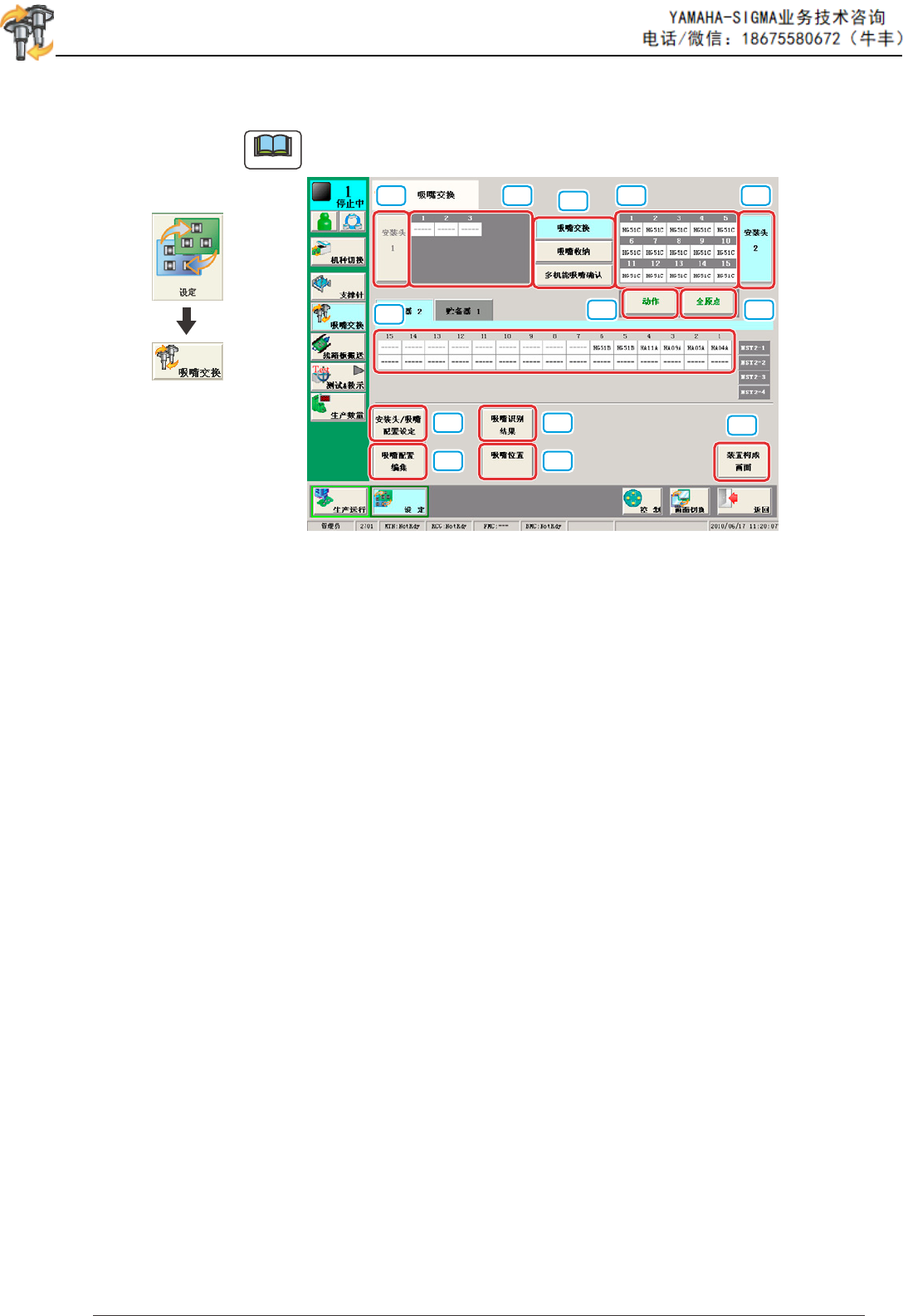 -28- 4.3 吸嘴交换 进行吸嘴交换的批量设定或手动设定操作。 Note 界面为在安装头 1 上安装了多功能安装头的情况。 [1] [2] [4] [5] [6] [7] [11] [3] [3] [2] [8] [9] [10] [1] 吸嘴储料器状态显示部 显示吸嘴储料器的状态, 设定为跳过的地址的背景色变为黄色。 [2] 贴装吸嘴状态显示部 显示贴装在各安装头上的吸嘴的状态。 [3] 安装头选择按钮 选择进行吸嘴交换的安装头,…