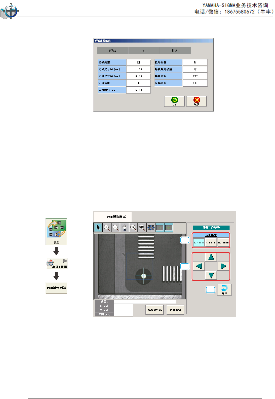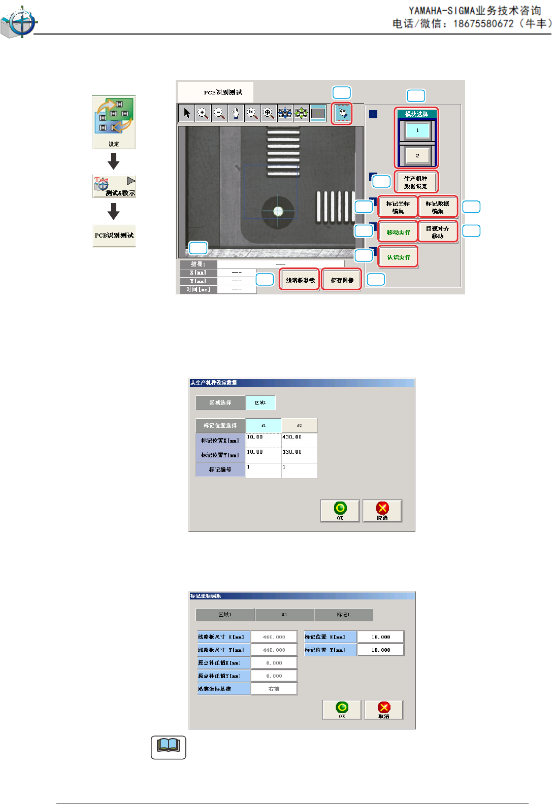 -43- [4] [ 标记数据编集 ( 编辑 )] 按钮 请按下各按钮,设定线路板识别标记数据。 [5] [ 移动实行 ] 按钮 将横梁移动到设定的位置。 [6] [ 目视对齐移动 ] 按钮 切换到用目视对齐进行识别位置指定的界面。 [7] [ 认识 ( 识别 ) 实行 ] 按钮 按下按钮,便准备线路板识别测试的实行。 [8] 识别结果 显示线路板识别测试的识别结果。 [9] [ 线路板移载 ] 按钮 显示 “ 线路板移载 ” 界面。 …