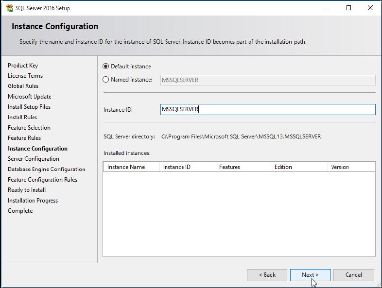 ► Leave the Default instance button selected to install the SQL Server using the MSSQLSERVER