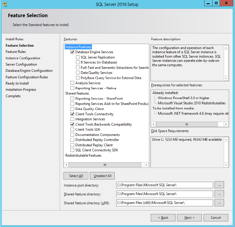 SQL Server 2016 / I nstallation Manual 12/2016 Edition 15 The Feature Selection window is displayed. Figure 4-9: Feature Selecti on window ► Ensure that the f ollowing features are selecte d: – Database Engine Service s …