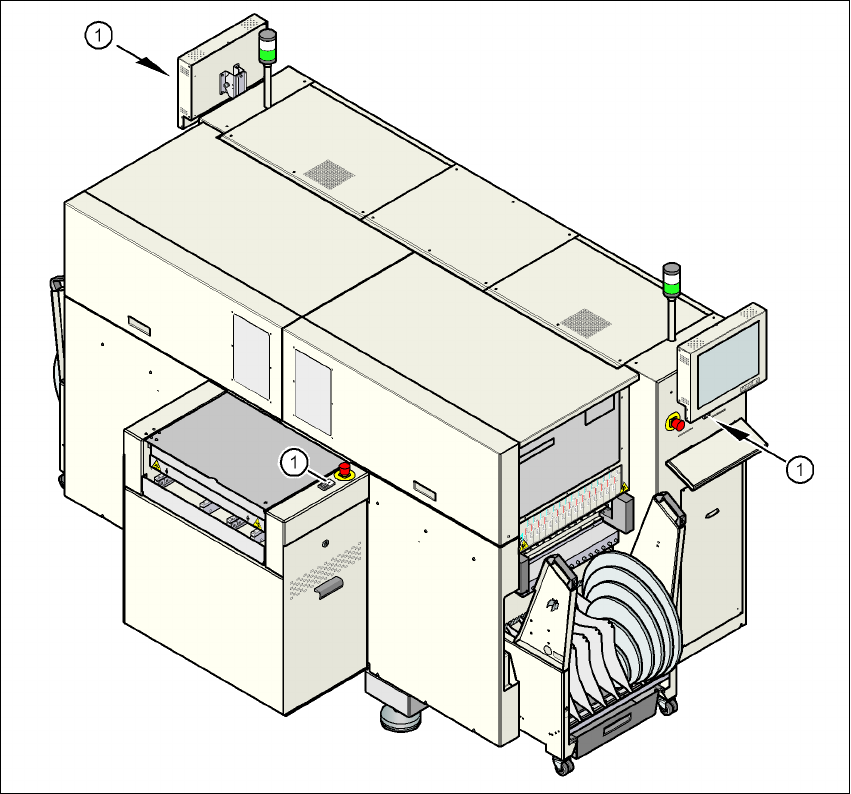Руководство по эксплуатации SIPLACE D1i/D2i 2 Производственная безопасность ПО - версия SR.605.03 SP2 и выше 2.6 Предохранительные ус тройства Издание 10/2012 RU 68 2 P ис . 2.6 - 2 Крышка на выв одном конв ейере (1) Кры…