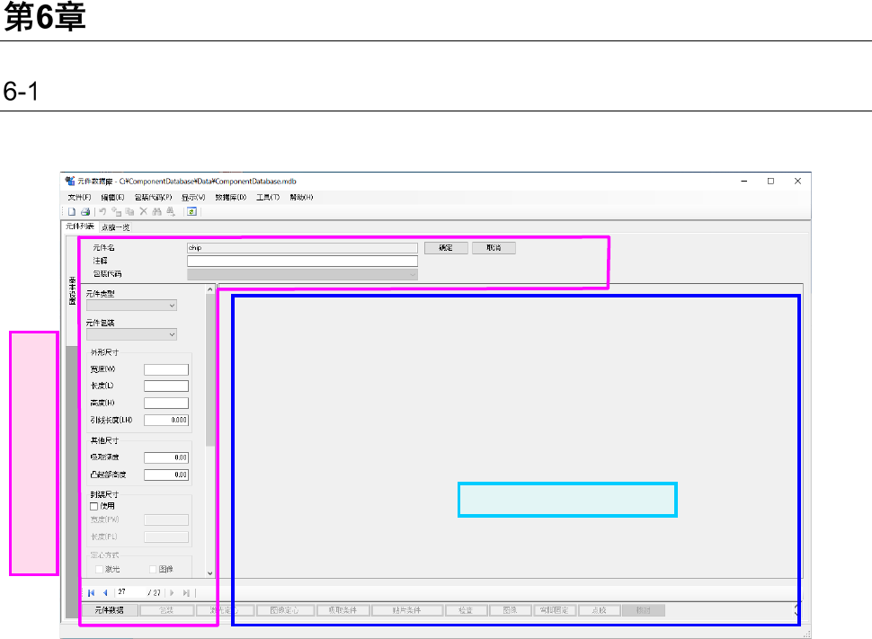 6-1 元件数 据详细 基本设置画面 在元件数据的基本设置画面,可编辑元件的类型、包装、尺寸、定心方式等基本数据。 详细设置区域 基 本 设 置 区 域