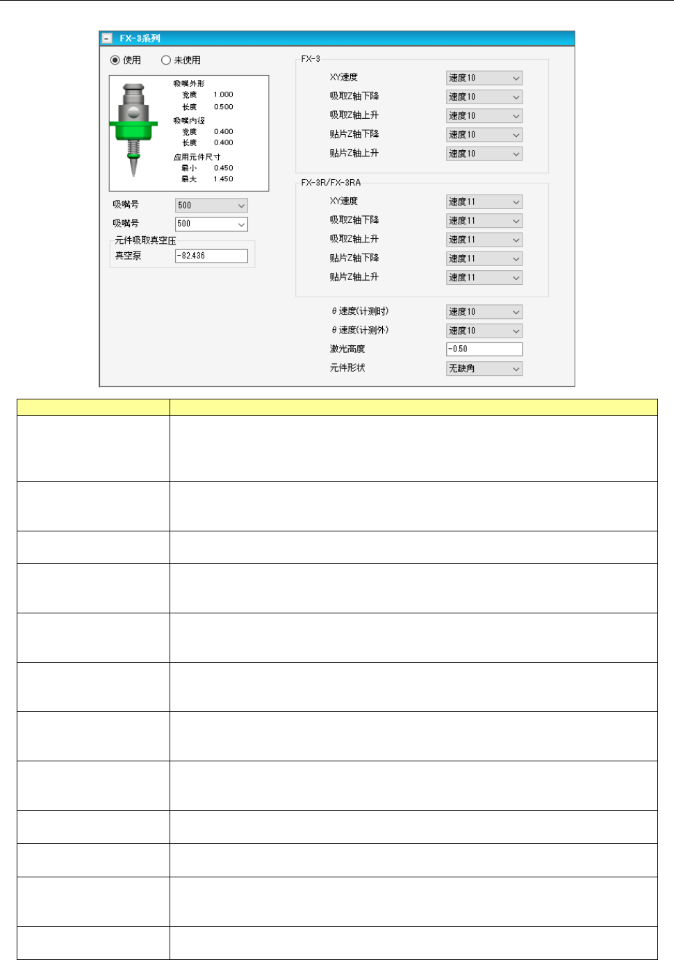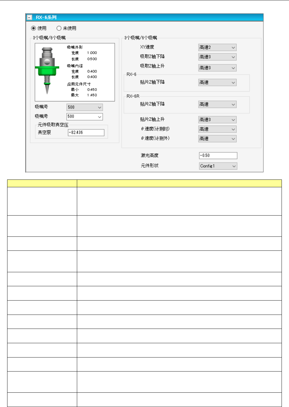 6- 12 6-2-7 激光定心 ( RX -6 系列 ) 激光定心 (RX -6 系列 ) 画面为设置有关 RX -6 系列固有数据的画面。 项目 内容 使用 / 未使用 选择是否使用 RX -6 系列的激光定心信息。 默认值为「使用」 。 ※如果设定为「未使用」,在编辑程序中调出元件数据时,由于未设置定心,因此请 在元件数据库中设定为「使用」后再调出。 吸嘴号(号码范围) 从组合框的下拉列表选择吸嘴号的号码范围。 根据选择内容吸嘴号…