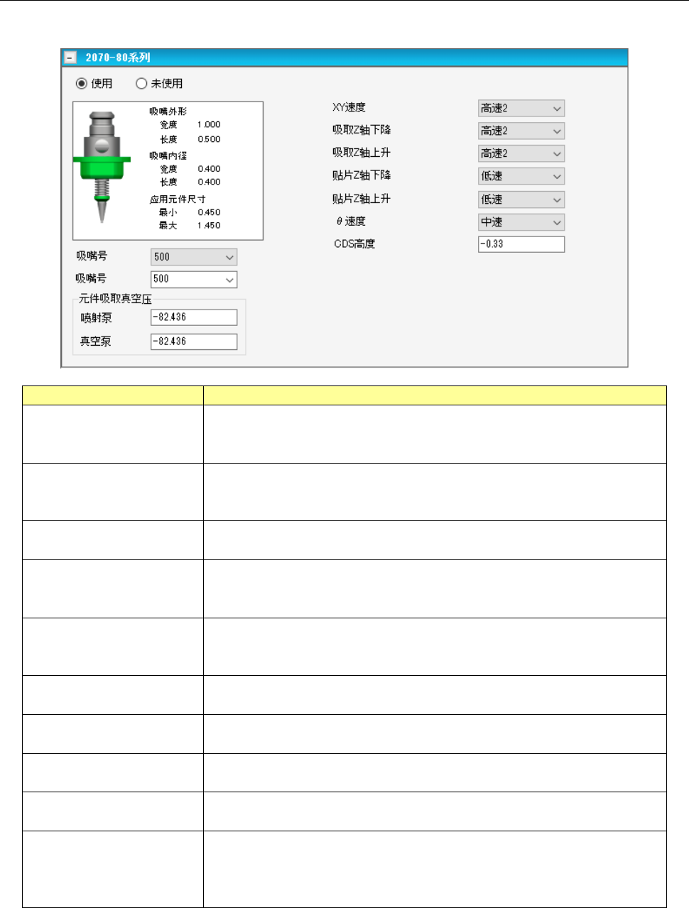6- 26 6-2- 20 图像定心 (2070 - 80 系列 ) 图像定心( 2070-80 系列)画面,可设置 2070-80 系列固有的有关数据。 项目 内容 使用 / 未使用 选择是否使用 2070 - 80 系列的图像定心信息。 ※ 如果设定为 「未使用」 , 在编辑程序中调出元件数据时, 由于未设置定心, 因此 请在元件数据库中设定为「使用」后再调出。 吸嘴号(号码范围) 从组合框的下拉列表选择吸嘴号的号码范围。 根据选择…