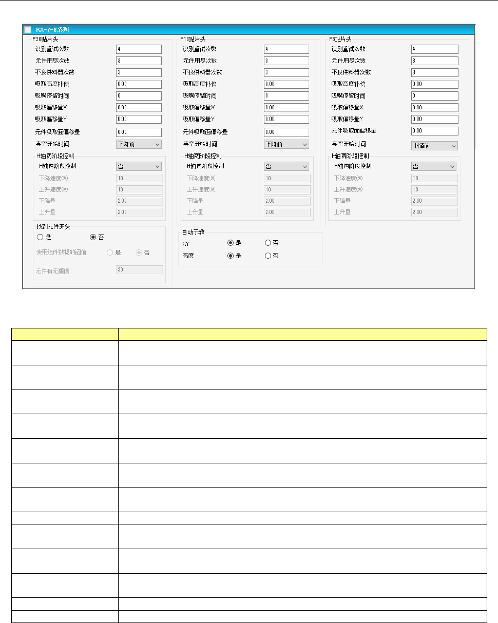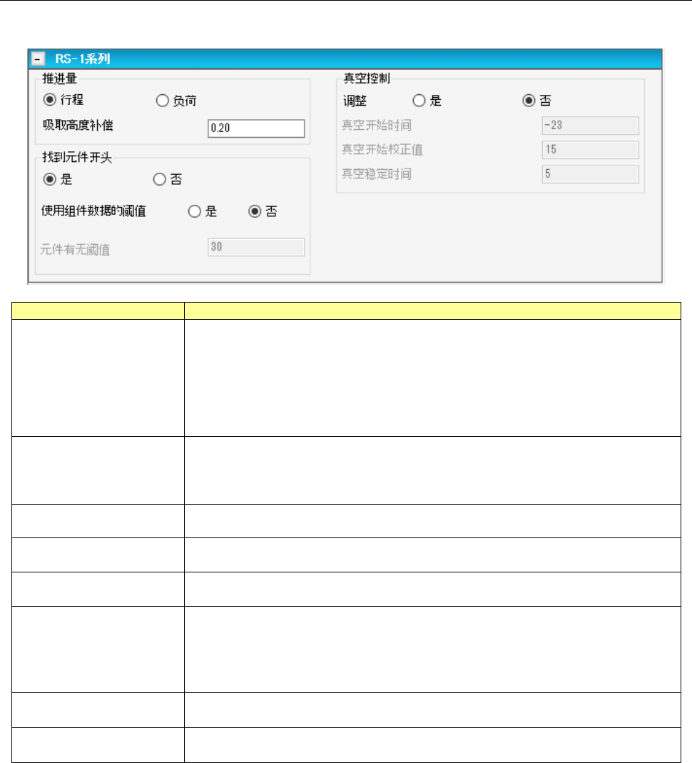 6- 32 6-2- 26 吸取条件 (RS -1 系列 ) 吸取条件( RS -1 系列)画面,可设置 RS -1 系列固有数据。 项目 内容 吸取高度补偿 以行程量( mm )输入吸取时吸嘴前端的推进量。 ・ 控制方式为「行程」时, 输入范围 : – 6.500 ~ 6.500mm 默认值 : 0.200mm 使用夹持吸嘴时 : 0.200mm 包装为「托盘」 : 1.000mm 外形尺寸短边不足 0.450mm 时 : 0.000…