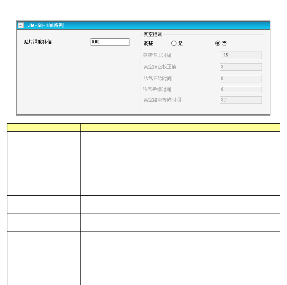 贴片条件(JM-50-100 系列)画面,可设置 JM-50-100 系列固有的有关数据。