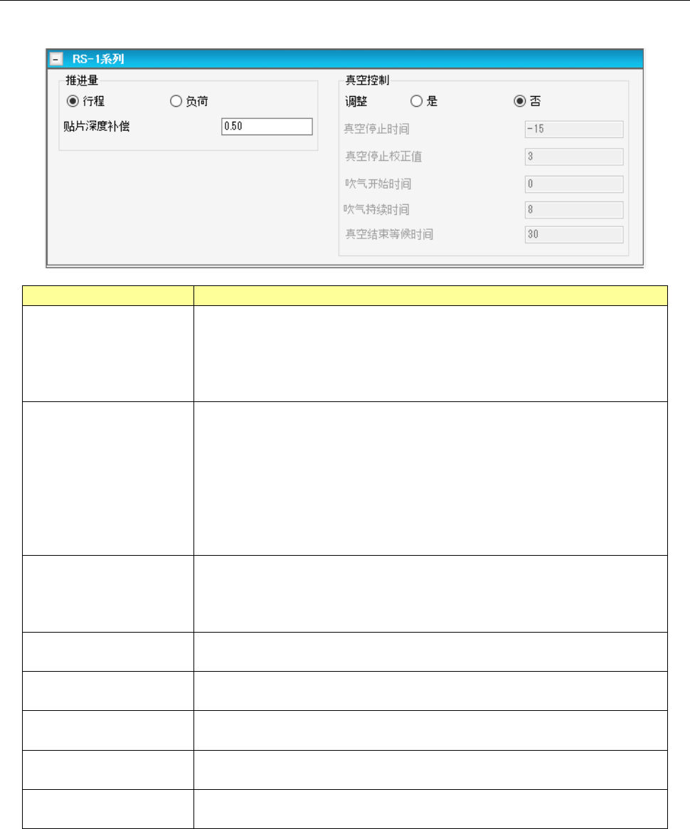6- 44 6-2- 38 贴片条件 (RS -1 系列 ) 贴片条件( RS -1 系列)画面,可设置 RS -1 系列固有的有关数据。 项目 内容 推进量 (控制方式) 用单选按钮选择推进元件时的控制方式是按行程推进,还是按负荷推进。 (默认:行程) 如果使用的吸嘴没有可负荷控制的吸嘴时,不能选择负荷。 控制方式发生更改后, 吸取条件及贴片条件的Z轴下降、 上升速度会被重新设置为 默认值。 推进量 ( 贴片深度补偿 ) 以行程量( …